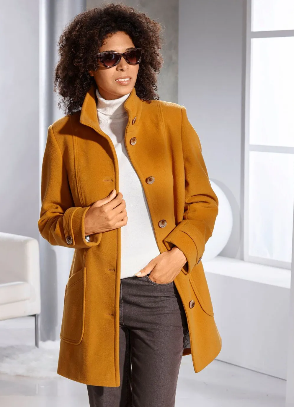 Longjacke mit hohem Tragekomfort: Stehkragen, Knopfleiste, aufgesetzte Taschen, Riegel mit Knopf an den Ärmelabschlüssen sowie eine Innentasche. Länge ca. 85 cm, bei K-Gr. ca. 80 cm.