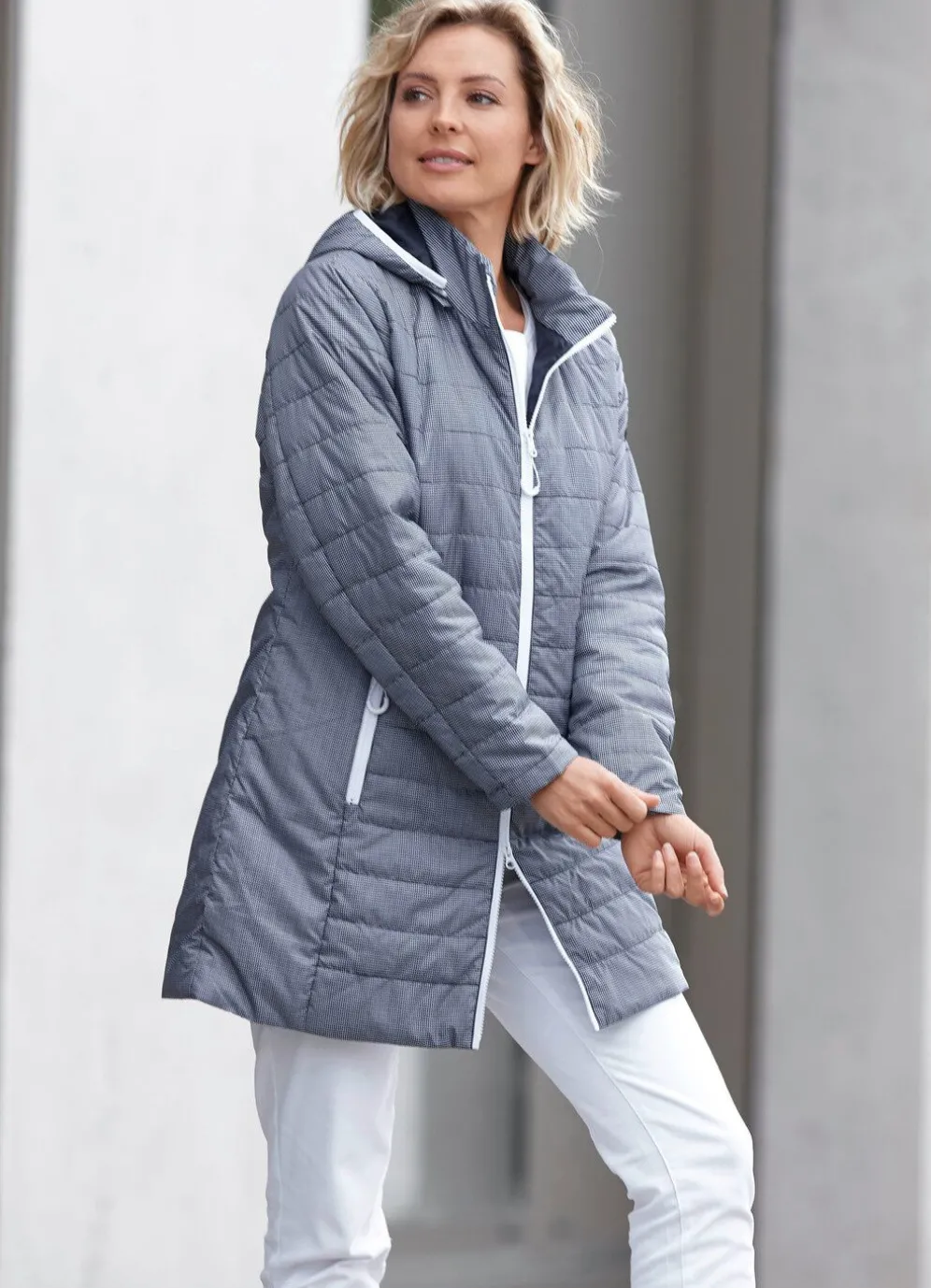 Longjacke mit Minimaldessin in Marine-Weiß: durch 2-Wege-Reißverschluss hoch schließbarer Stehkragen, Reißverschlusstaschen, umschlagbare Ärmel sowie eine Innentasche. Länge ca. 84 cm.