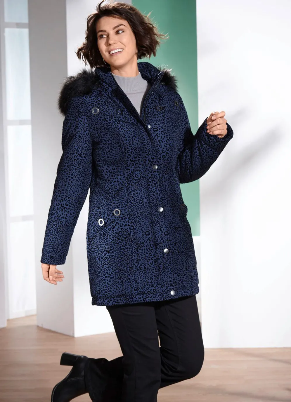 Außergewöhnliche, blaue Longjacke mit dekorativem, samtig beflocktem Raubtierfell-Dessin in Schwarz: abnehmbare Kapuze mit Durchzugsband, Stopper und abnehmbarem Kunstpelz-Besatz, durch 2-Wege-Reißverschluss unter der Druckerleiste hoch schließbarer Stehkragen, umschlagbare Ärmel, eine Innentasche, Zierösen auf der Blende der Taschen sowie im Vorder- und Rückteil. Länge ca. 85 cm, bei K-Gr. ca. 80 cm.