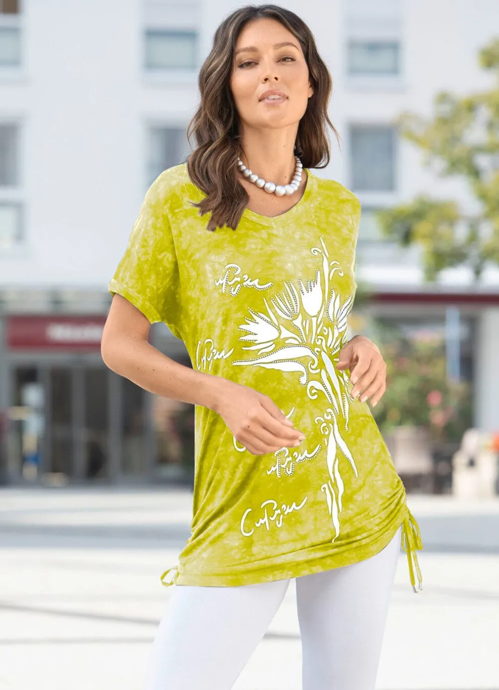 Jedes Teil ein Unikat! Große Klasse ist dieses fantasievolles Longshirt in Batik-Optik mit Kontrast-Druck und Strasszier im Vorderteil, überschnittener Schulterpartie mit Einfass sowie Raffung durch seitliche Bindebänder.