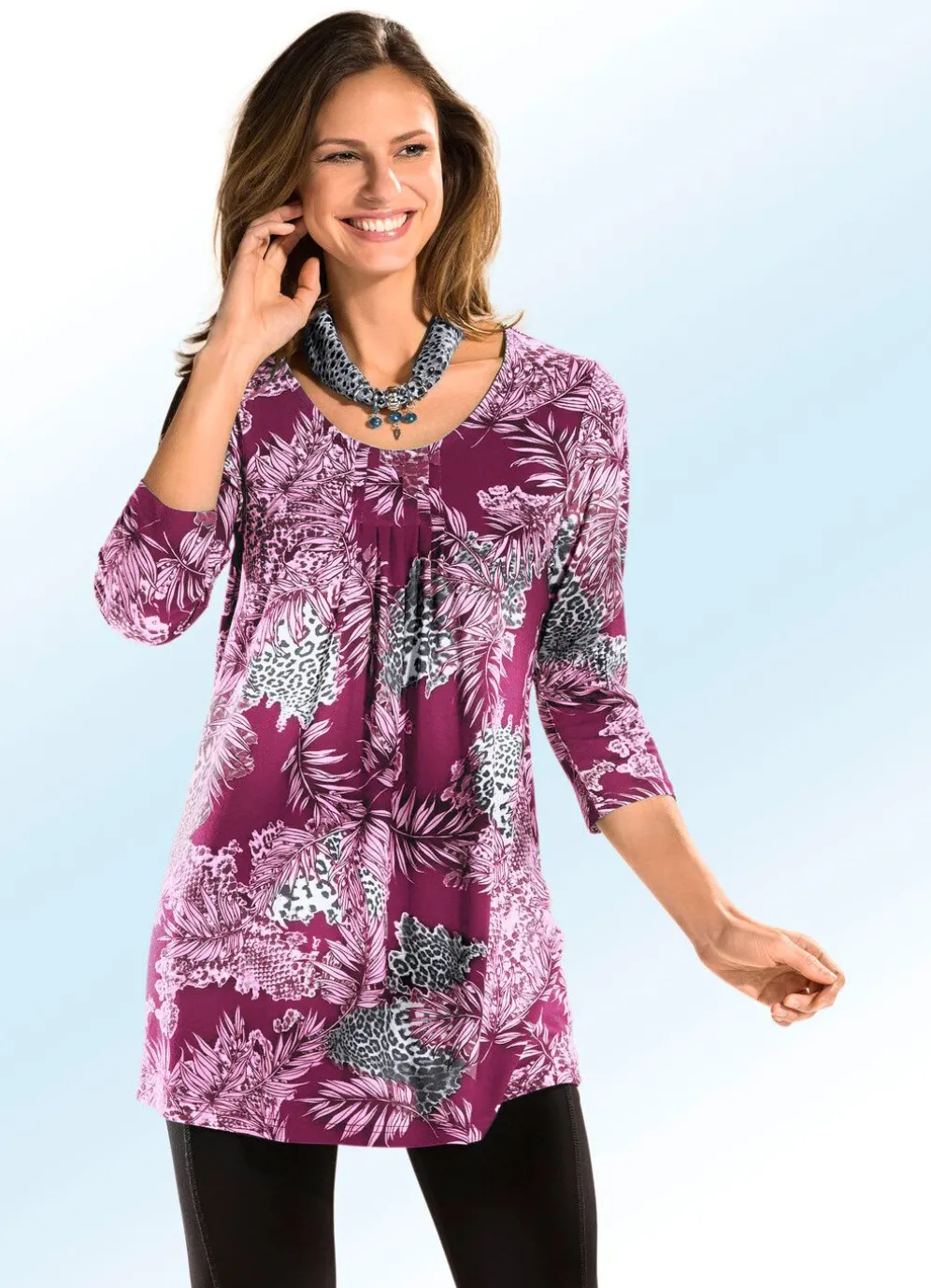 Jedes Teil ein Unikat! Herrliches Shirt mit Allover-Dessin und hübscher Faltenlegung am runden Halsausschnitt sowie 3/4-langen Ärmeln.