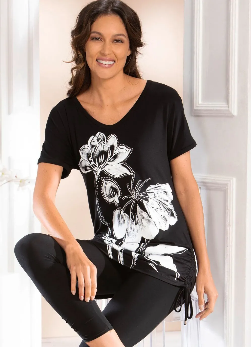Longshirt in Schwarz mit weißem, farbbrillantem Kontrastdruck und Metallplättchenzier im Vorderteil, überschnittener Schulterpartie sowie seitlicher Raffung mit Bindebändern am Saumabschluss.