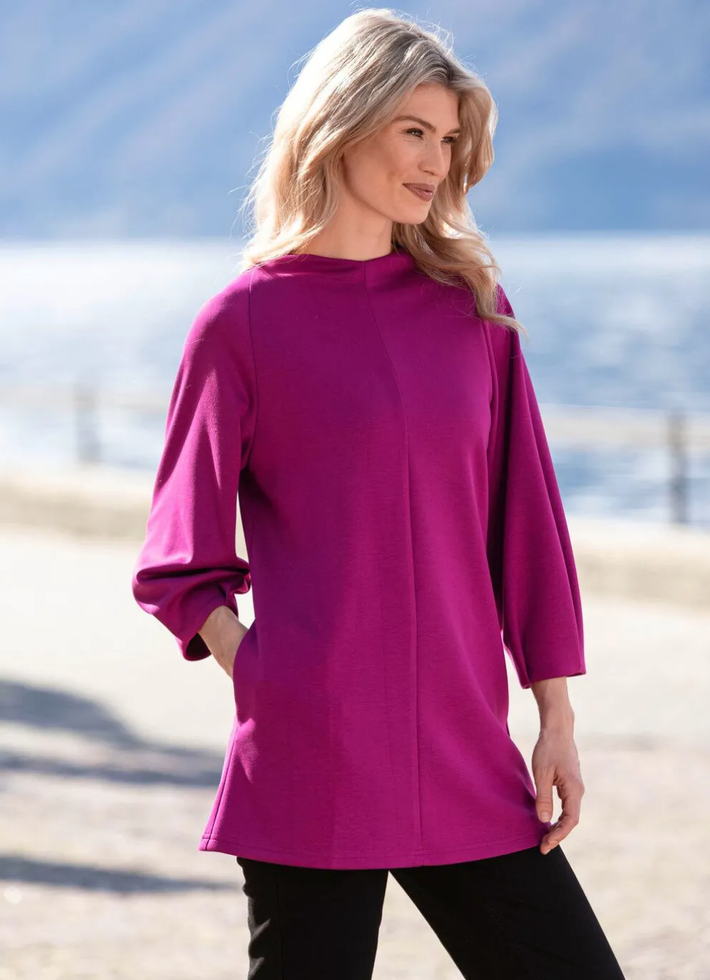 Attraktives, fuchsiafarbenes Longshirt in leicht ausgestellter Form, mit Teilungsnaht im Vorder- und Rückteil, seitlichen Eingrifftaschen sowie 3/4-langen Ärmeln.
