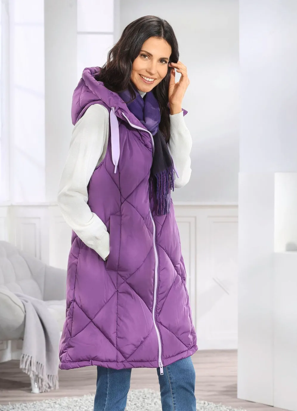 Amethystfarbene Longweste: feste Kapuze mit Bindeband, 2-Wege-Reißverschluss, Schubtaschen mit breiter Blende, eine Innentasche sowie leicht verlängertes, abgerundetes Rückteil. Länge ca. 100 cm. Die Qualität: Micro-Popeline und Watte jeweils aus 100% Polyester. Waschbar Longweste: feste Kapuze mit Bindeband, 2-Wege-Reißverschluss, Schubtaschen mit breiter Blende, eine Innentasche sowie leicht verlängertes, abgerundetes Rückteil. Länge ca. 100 cm.