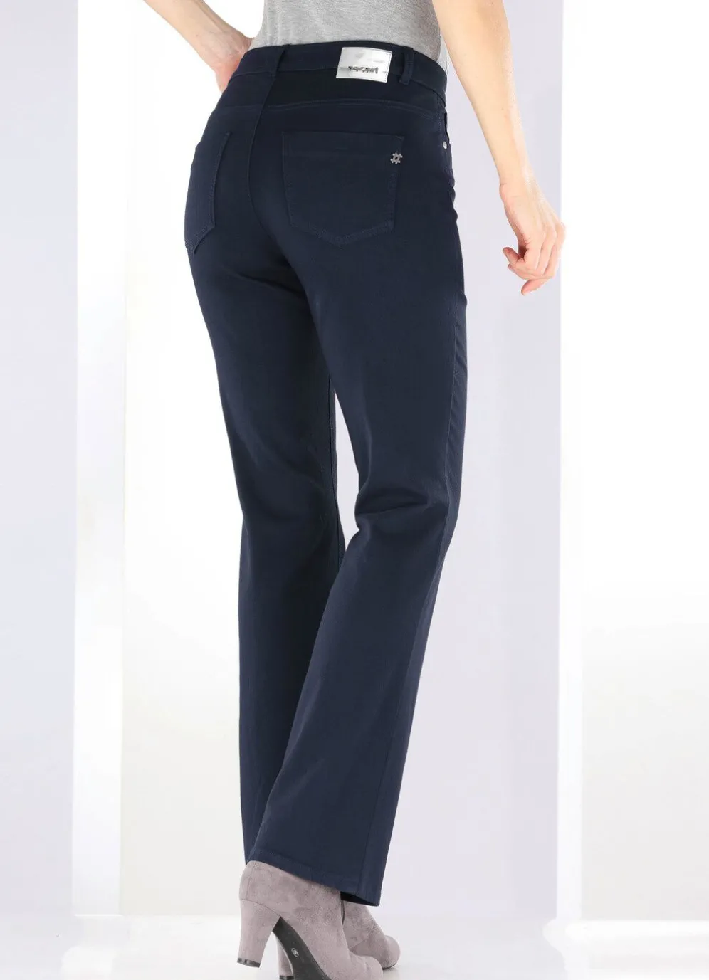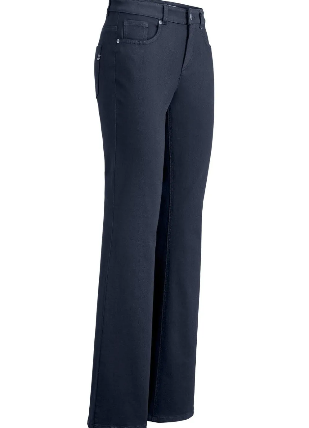 Magic-Jeans mit modisch weiterem Beinverlauf, hohem Stretchanteil und exzellentem Rücksprungverhalten, weshalb sie eine Größe kleiner passt, ohne einzuengen: 5-Pocket-Form, elastischer Bund, Gürtelschlaufen, Knopf- und Reißverschluss, Ziernieten an allen Taschen sowie Jeanssattel. Ohne Gürtel. Innenbeinlänge ca. 79 cm, Fußweite ab 46 cm.