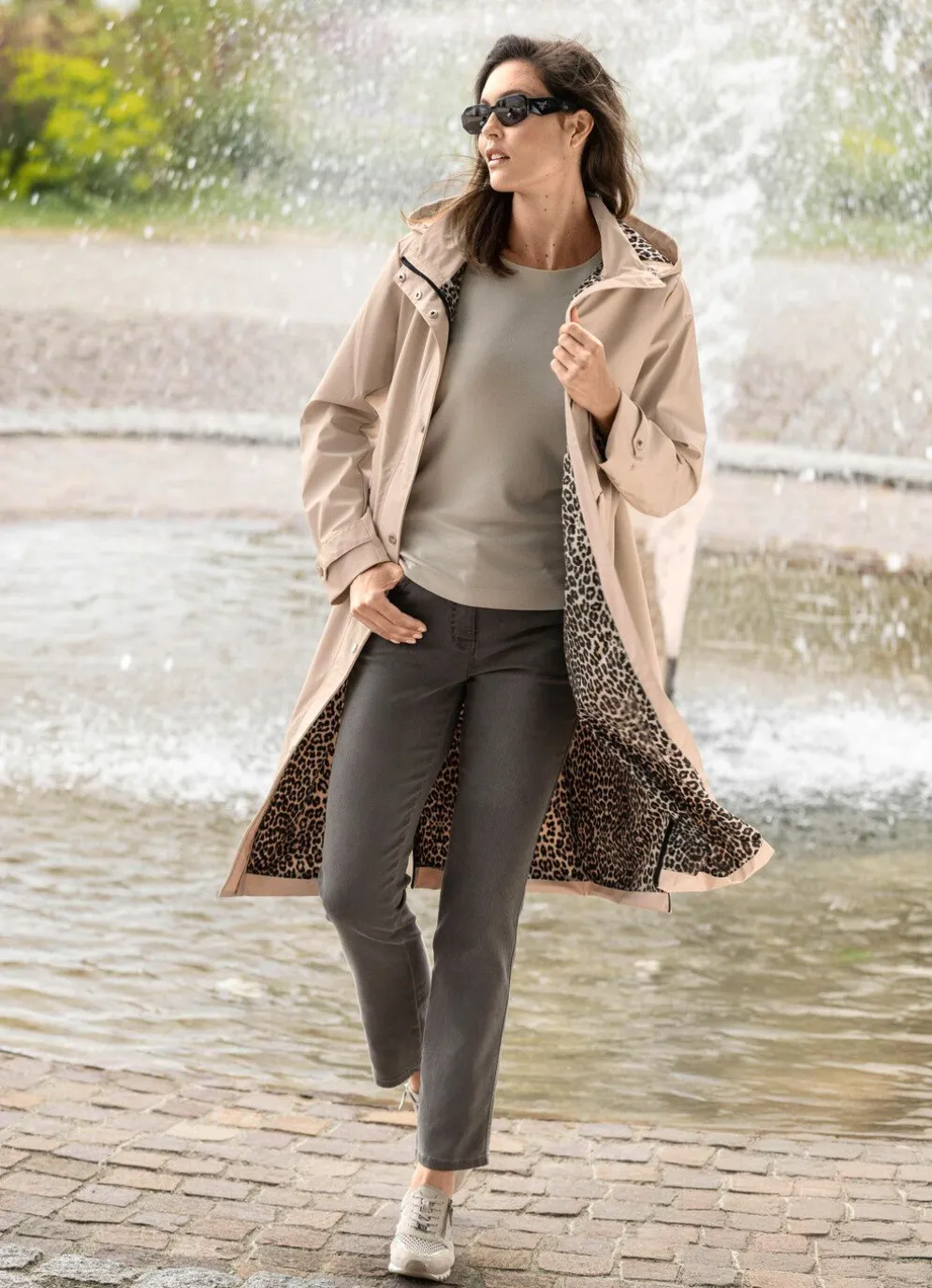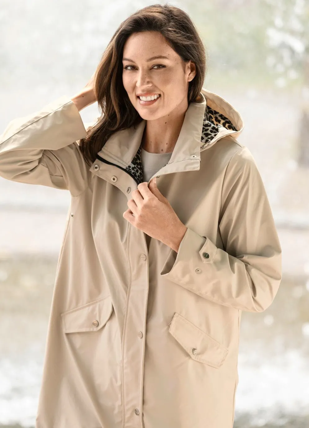 Kittfarbener Mantel in leichter A-Linie mit Durchzugsband und Stopper an der abnehmbaren Kapuze, durch 2-Wege-Reißverschluss unter der Druckerleiste hoch schließbarem Stehkragen, Drucker an den Pattentaschen, weitenregulierbarem Riegel und Drucker an den Ärmelabschlüssen, Reißverschluss an den Seitenschlitzen sowie einer Innentasche. Länge ca. 100 cm, ab Gr. 42 ca.103 cm, ab Gr. 48 ca. 106 cm.