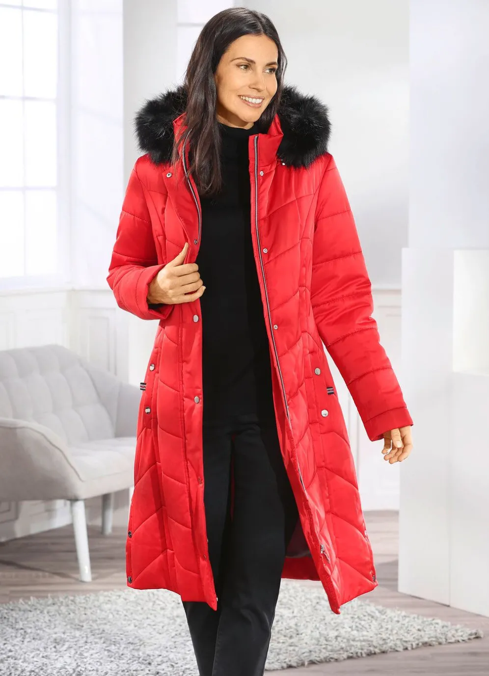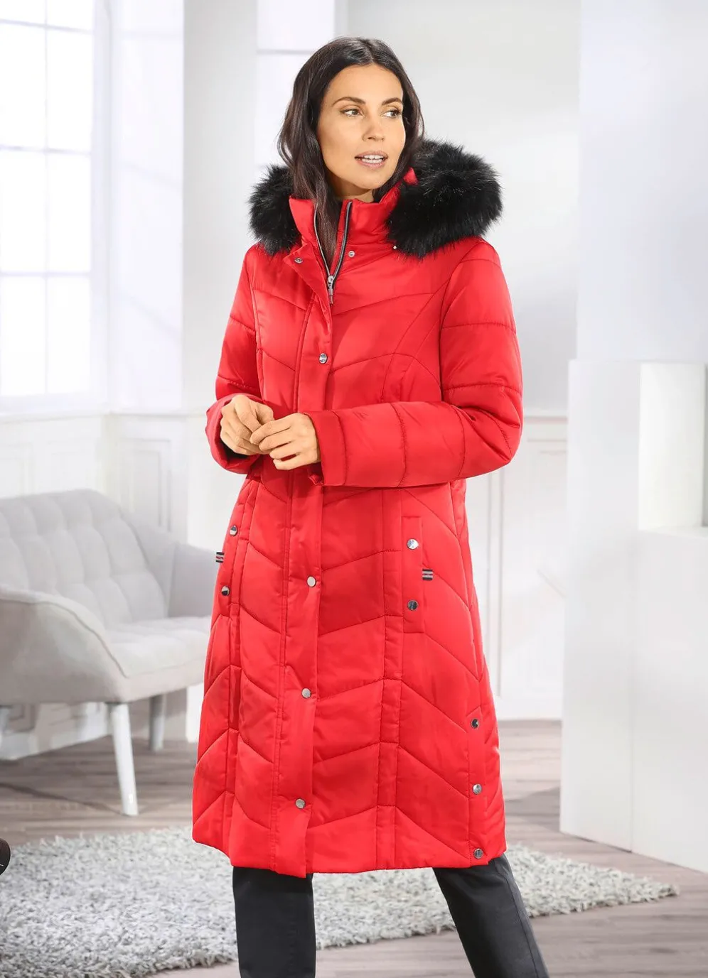 Dieser faszinierende, tomatenrote Mantel punktet mit schwarzen Ziersteppnähten, Durchzugsband, Stopper und abnehmbarem Kunstpelz-Besatz an der abnehmbaren Kapuze, durch Reißverschluss unter der Druckerleiste hoch schließbarem Stehkragen, Blende und Druckern an den Schubtaschen, umschlagbaren Ärmeln, Druckern an den Seitenschlitzen sowie einer Innentasche. Länge ca. 102 cm.