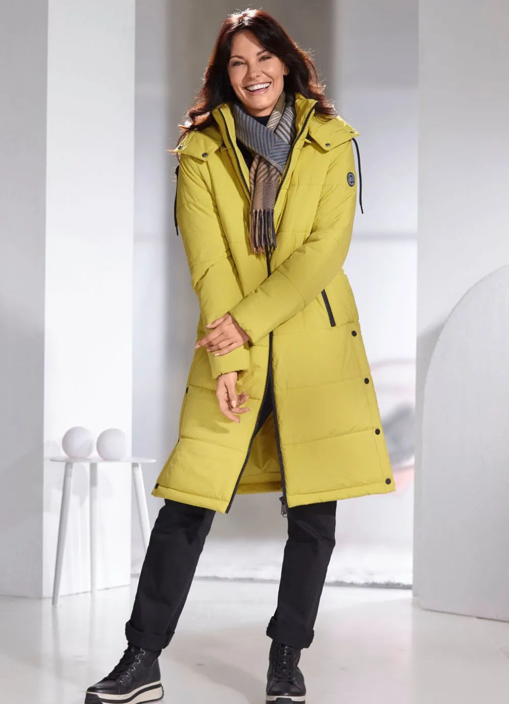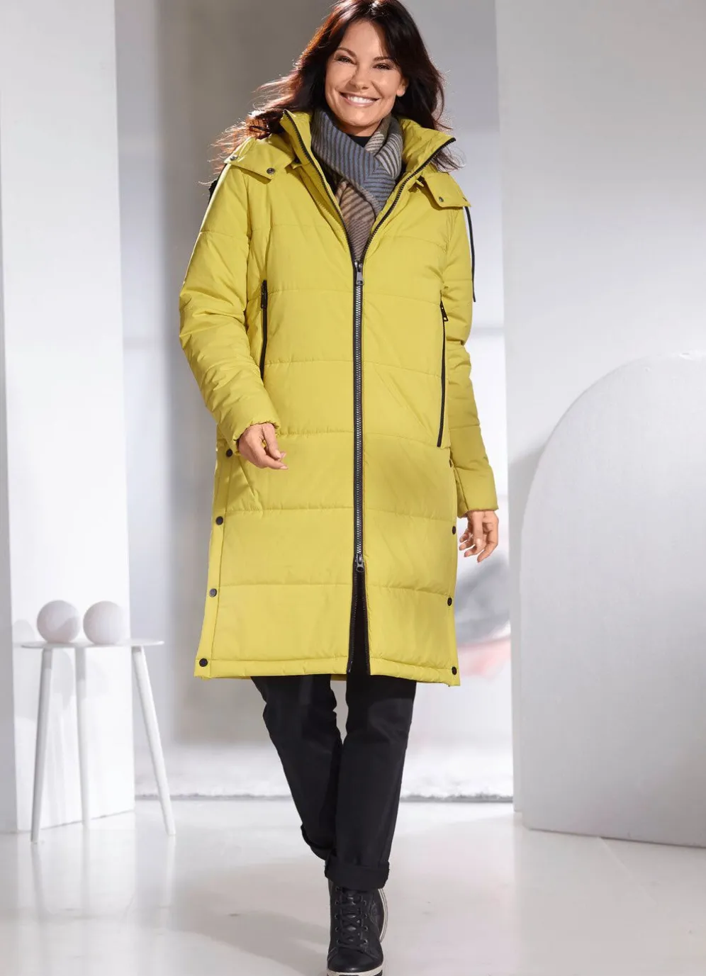 Trendstarker Mantel mit Riegel, Druckern und Durchzugsband an der abnehmbaren Kapuze, durch 2-Wege-Reißverschluss hoch schließbarem Stehkragen, geräumigen Reißverschlusstaschen, Druckern an den Seitenschlitzen, elastischen Ärmelabschlüssen sowie einer Innentasche. Länge ca. 102 cm, ab Gr. 42 ca. 104 cm, ab Gr. 48 ca. 106 cm.