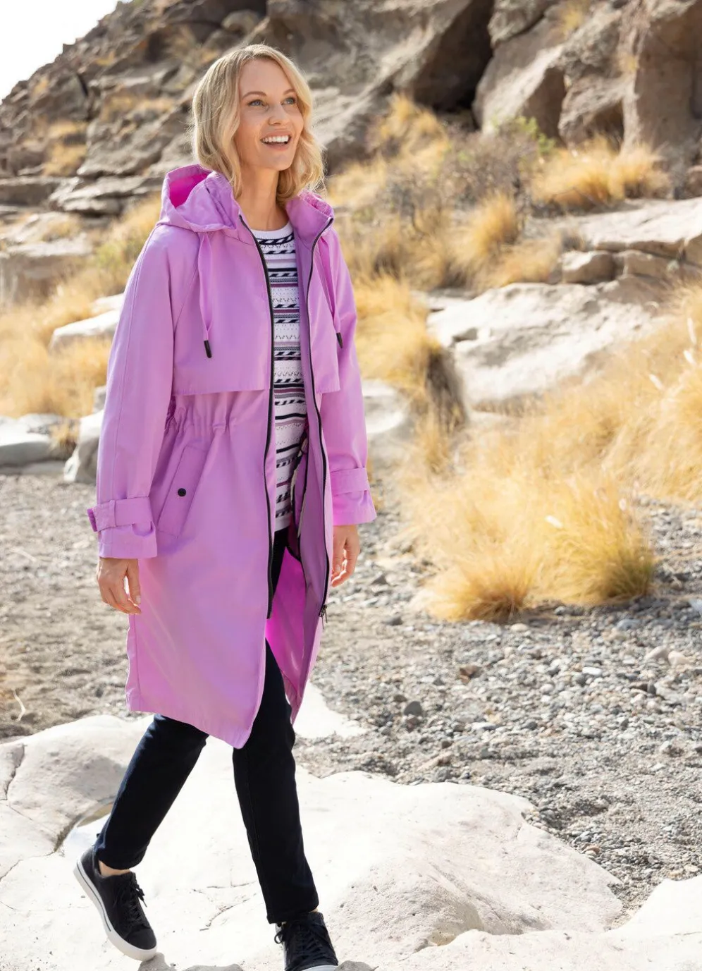 Mantel: abnehmbare Kapuze mit Bindeband, durch 2-Wege-Reißverschluss hoch schließbarer Stehkragen, Vorder- und Rückteilkoller, Durchzugsband und Stopper in der Taille, Schubtaschen mit Blende und Drucker sowie verstellbarer Riegel mit Drucker an den Ärmelabschlüssen. Länge ca. 102 cm.
