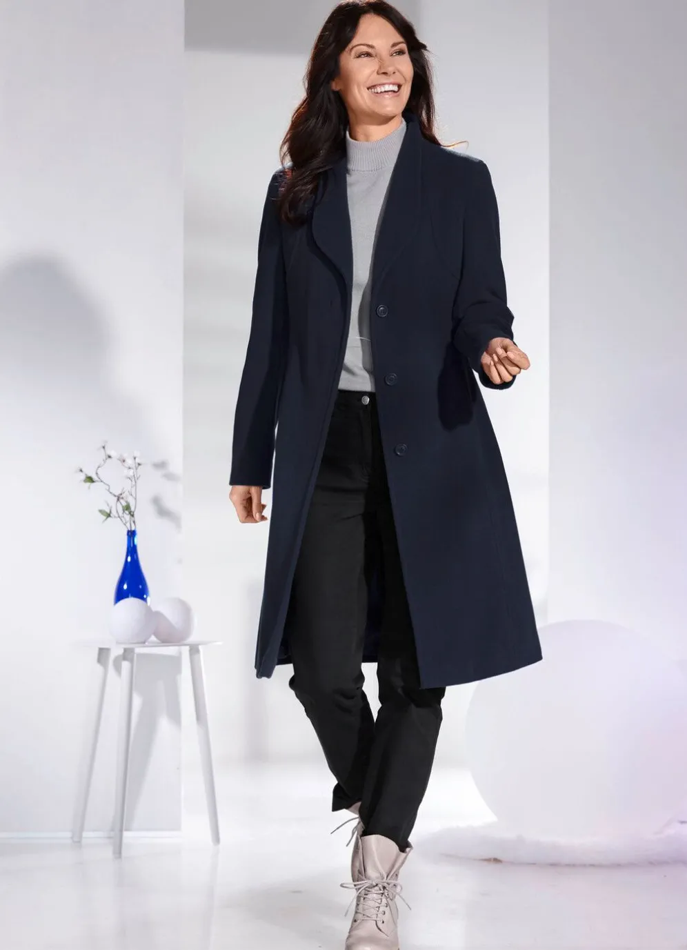 Stilsicherer Mantel mit Kragen, elegant verdeckter Knopfleiste sowie Nahttaschen. Länge ca. 102 cm.