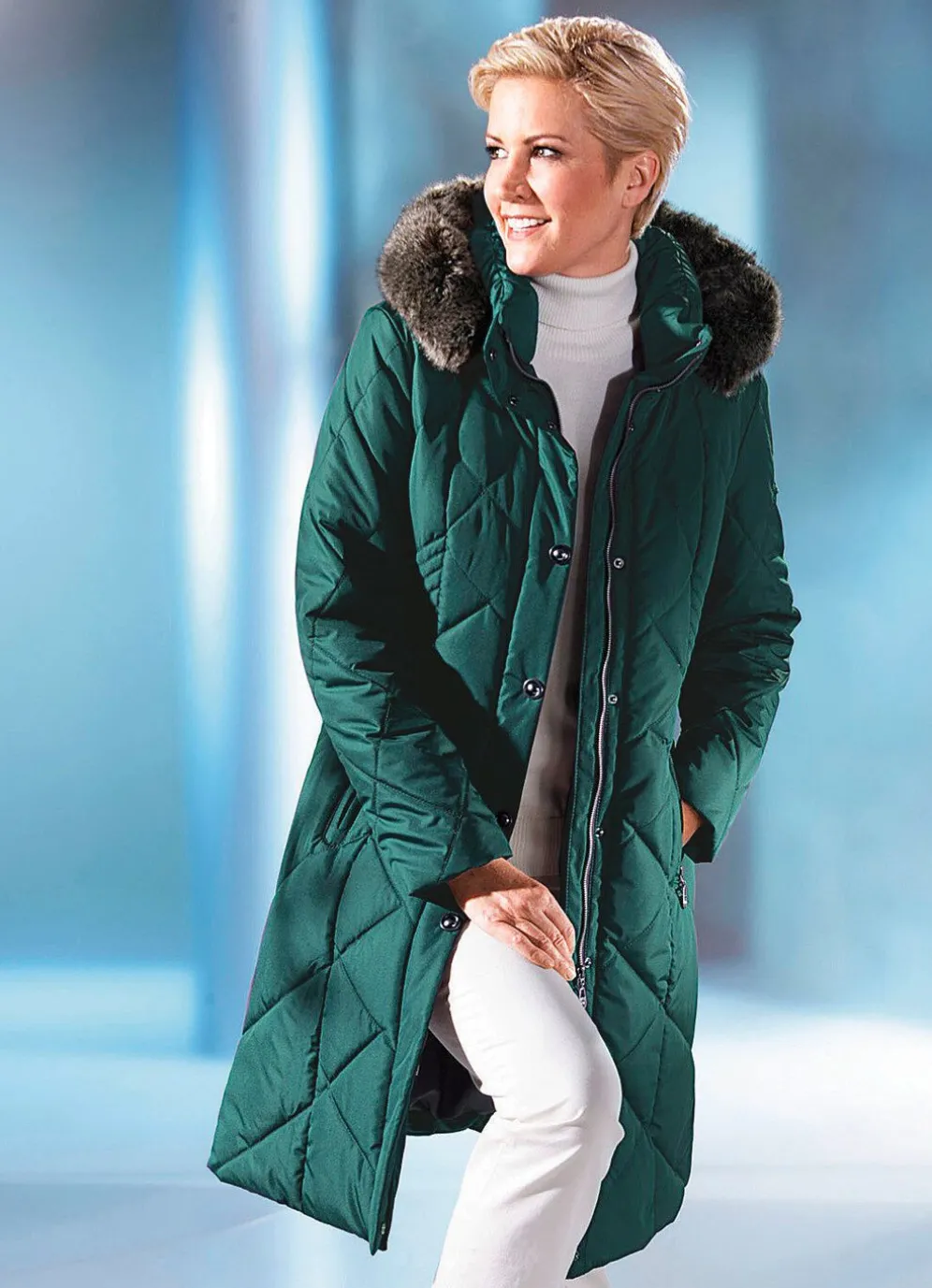Große Klasse ist dieser herrliche, beerefarbene Mantel mit hohem Tragekomfort, Durchzugsband und Stopper in der abnehmbaren Kapuze mit abnehmbarem Kunstpelz-Besatz, figurfreundlichem Stepp, gesmoktem Stehkragen, Reißverschluss unter der Druckerleiste, umschlagbaren Ärmeln sowie einer Innentasche. Länge ca. 100 cm.