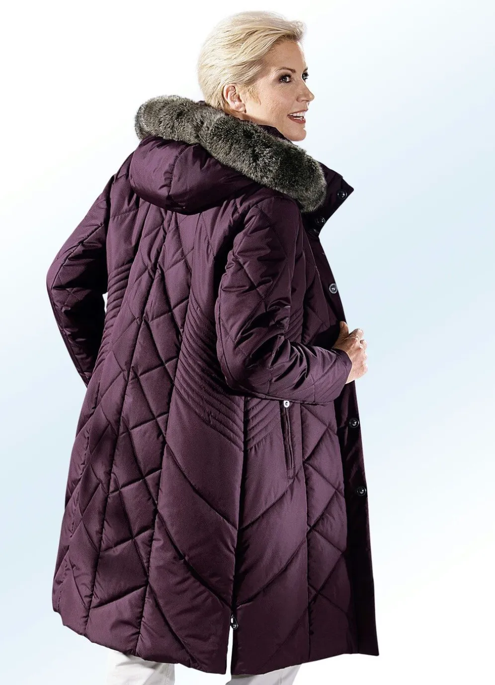 Große Klasse ist dieser herrliche, beerefarbene Mantel mit hohem Tragekomfort, Durchzugsband und Stopper in der abnehmbaren Kapuze mit abnehmbarem Kunstpelz-Besatz, figurfreundlichem Stepp, gesmoktem Stehkragen, Reißverschluss unter der Druckerleiste, umschlagbaren Ärmeln sowie einer Innentasche. Länge ca. 100 cm.