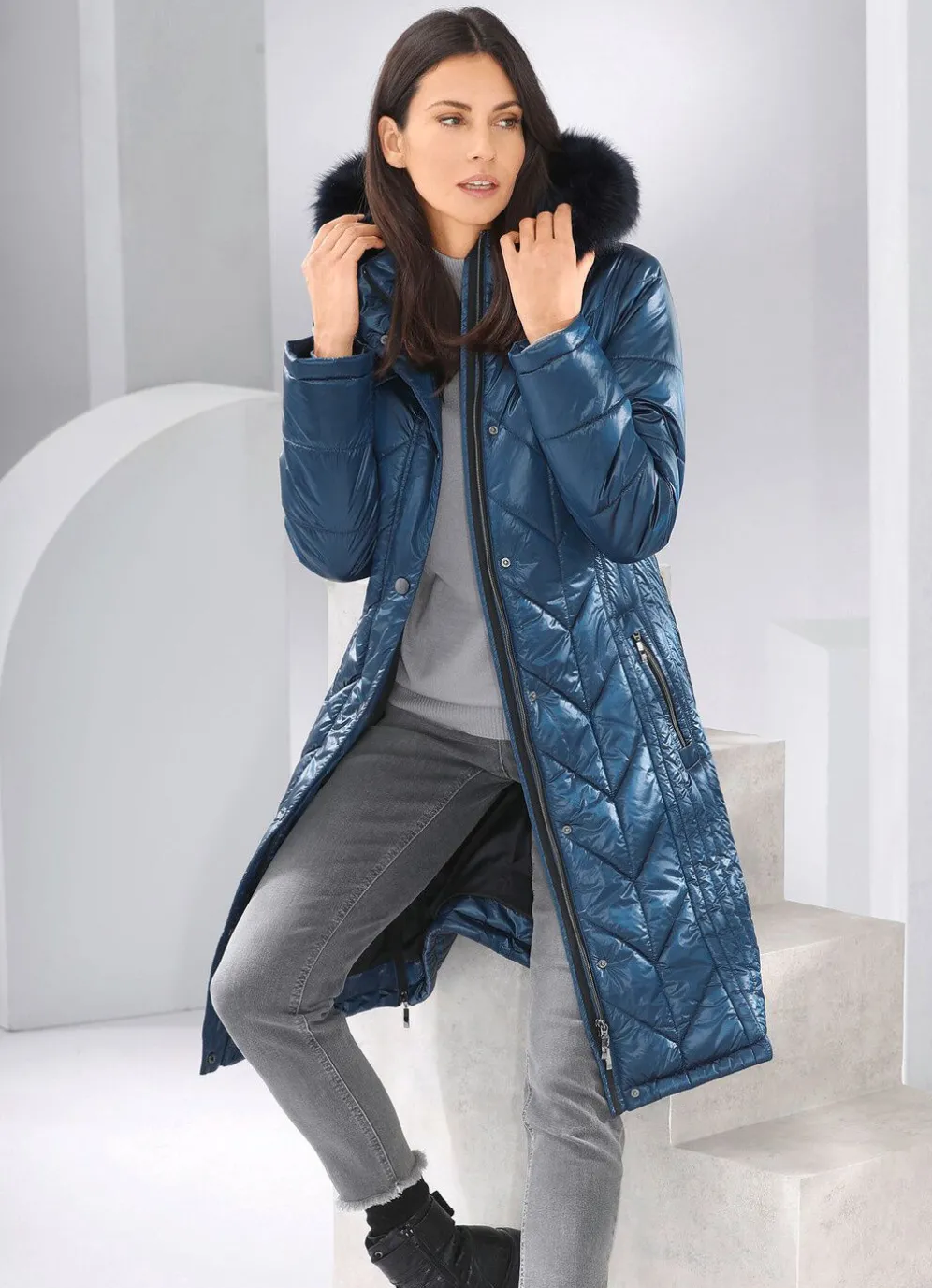 Mantel mit figurfreundlicher Längssteppung seitlich, abnehmbarer Kapuze mit Durchzugsband, Stopper und abnehmbarem Kunstpelz-Besatz, durch 2-Wege-Reißverschluss hoch schließbarem Stehkragen, Reißverschluss an den Paspeltaschen und Seitenschlitzen, umschlagbaren Ärmeln sowie einer Innentasche. Länge ca. 100 cm.