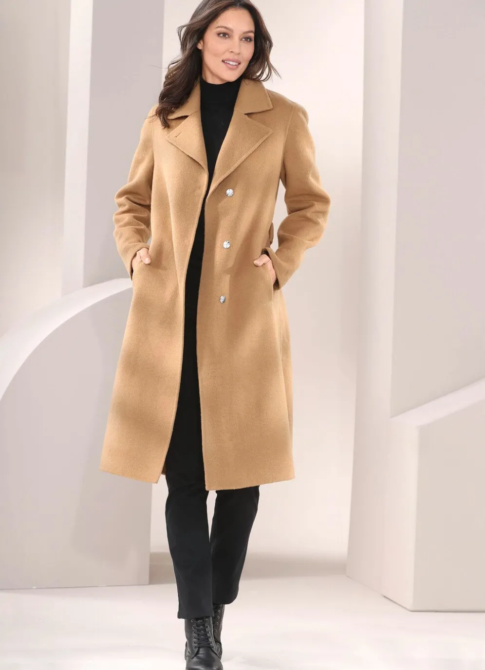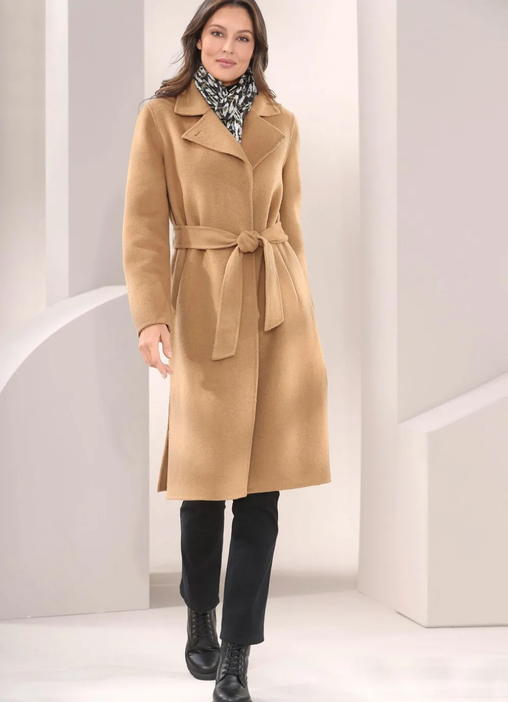 Bezaubernder, beidseitig geschlitzter Mantel in Hellbraun, mit Reverskragen, verdeckter Druckerleiste, Gürtelschlaufen, Bindegürtel, Schubtaschen sowie umschlagbaren Ärmeln. Länge ca. 110 cm.