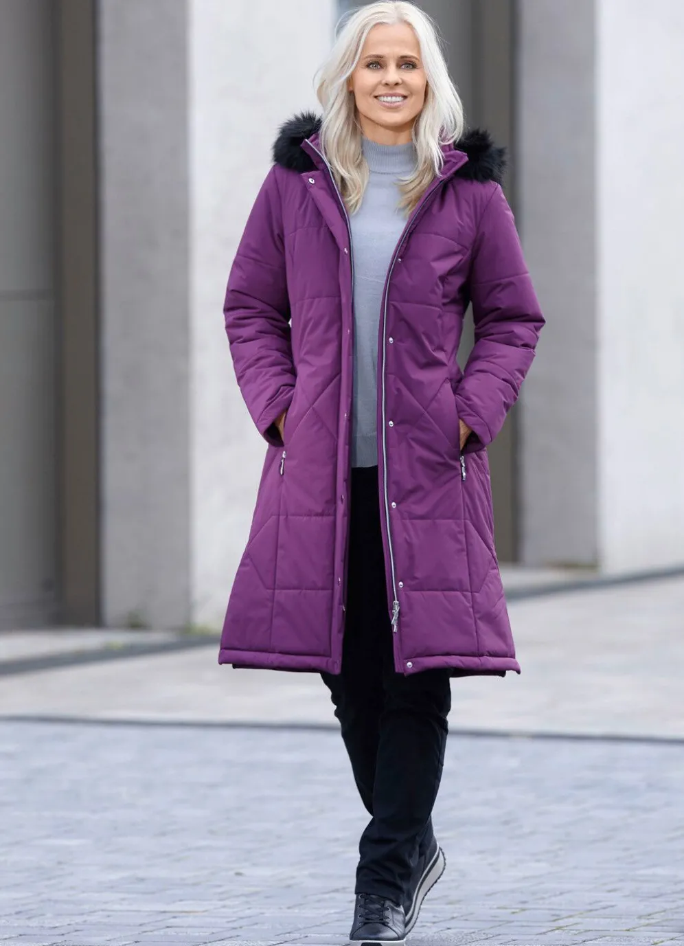 Pfiffiger Kurzmantel mit Durchzugsband, Stopper und abnehmbarem Kunstpelz-Besatz an der abnehmbaren Kapuze, hoch schließbarem Stehkragen, 2-Wege-Reißverschluss unter der Druckerleiste, Reißverschluss an den Taschen und Seitenschlitzen, umschlagbaren Ärmeln sowie zwei Innentaschen. Länge ca. 103 cm.