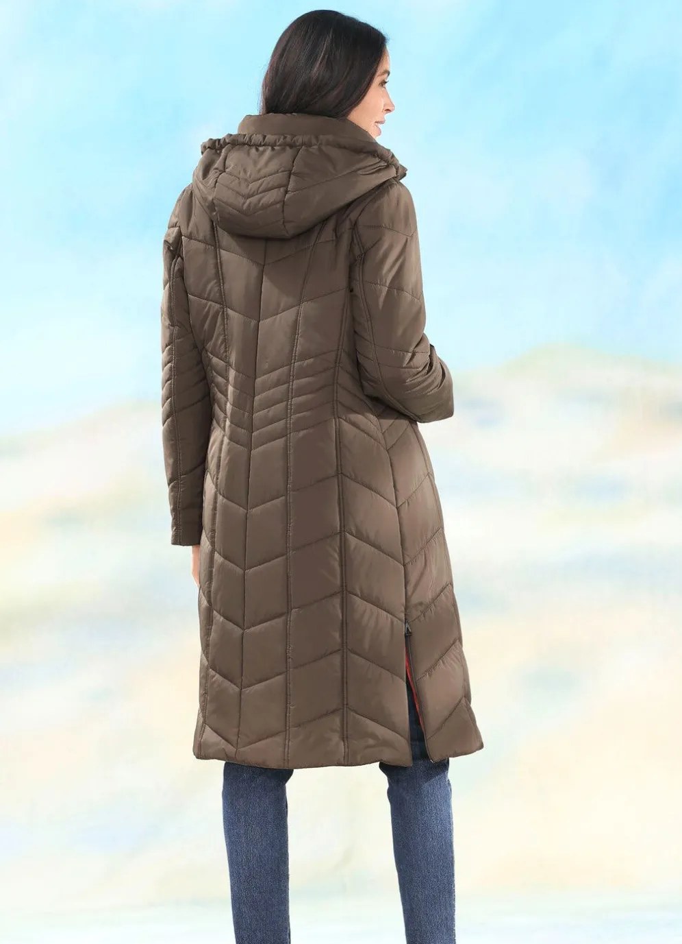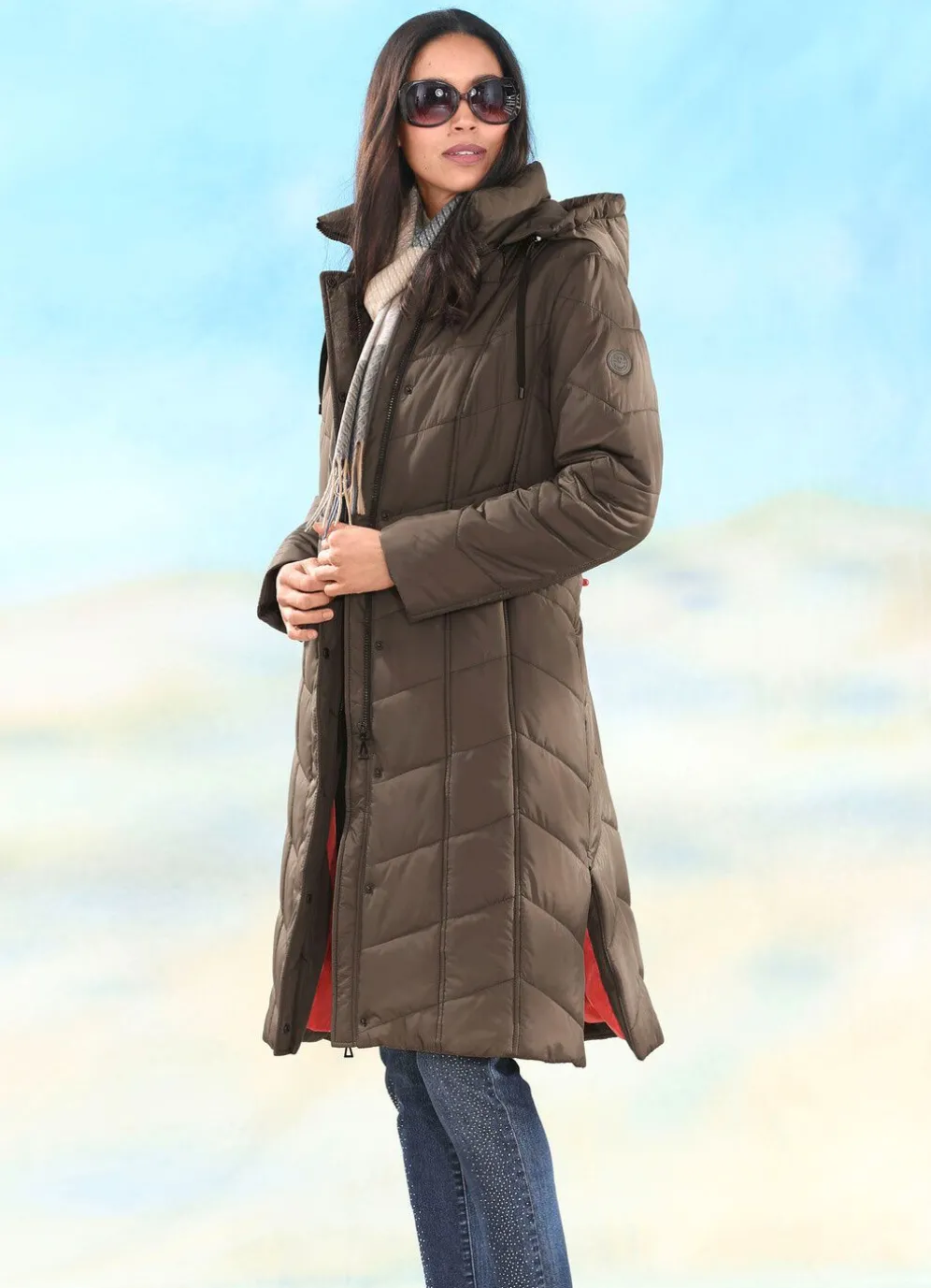Ansprechender Mantel mit Durchzugsband und Stopper in der abnehmbaren Kapuze, durch Reißverschluss unter der Druckerleiste hoch schließbarem Stehkragen, Reißverschluss an den Nahttaschen und Seitenschlitzen, umschlagbaren Ärmeln sowie einer Innentasche. Länge ca. 105 cm.