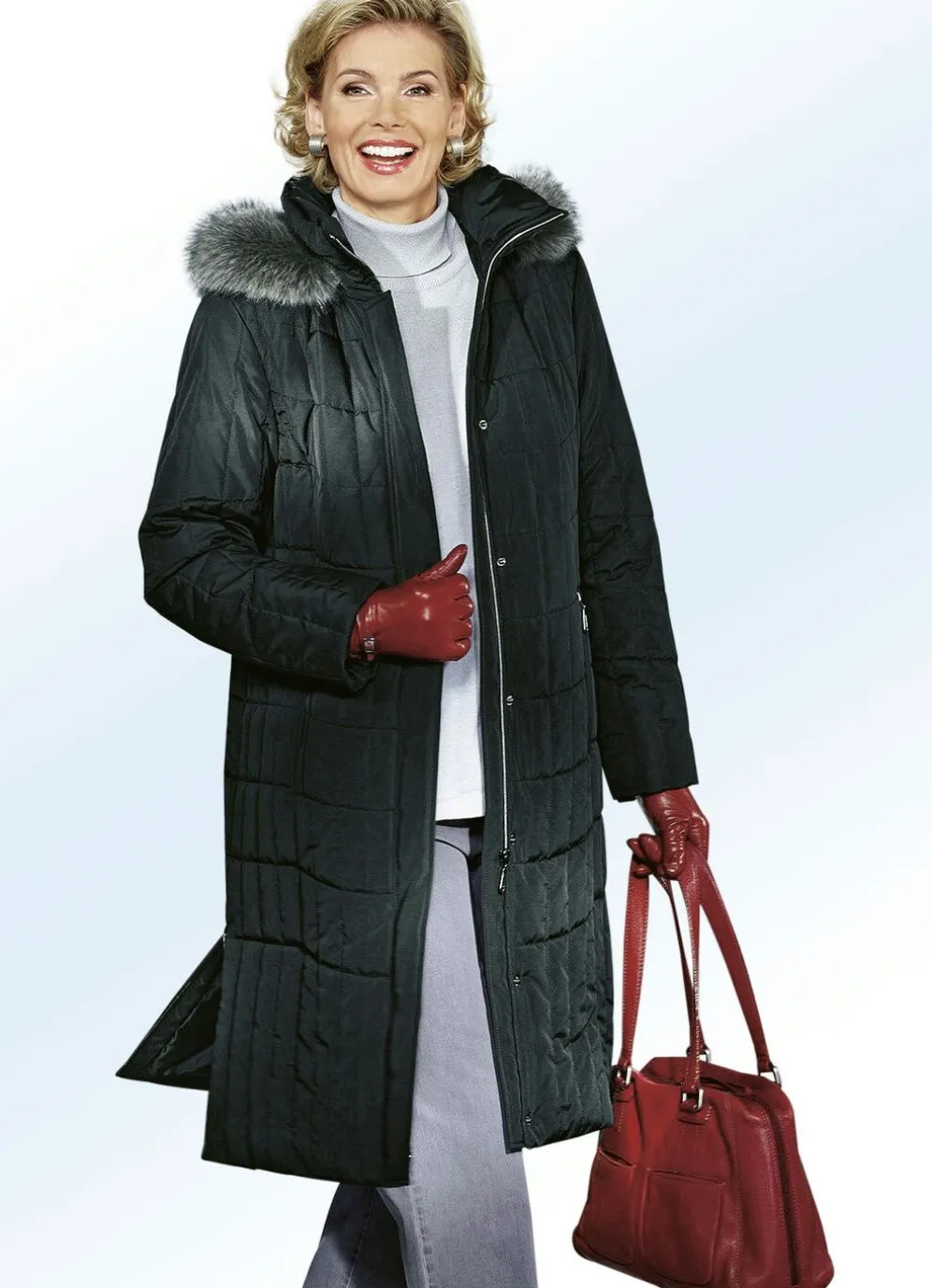 Interessanter, dunkelgrüner Mantel, mit abnehmbarem Kunstpelz-Besatz an der abnehmbaren Kapuze, durch verdeckten Reißverschluss unter der Druckerleiste hoch schließbarem Kragen, Paspeltaschen mit Reißverschluss, umschlagbaren Ärmeln, Seitenschlitzen mit Reißverschluss sowie zwei Innentaschen. Länge ca. 105 cm.