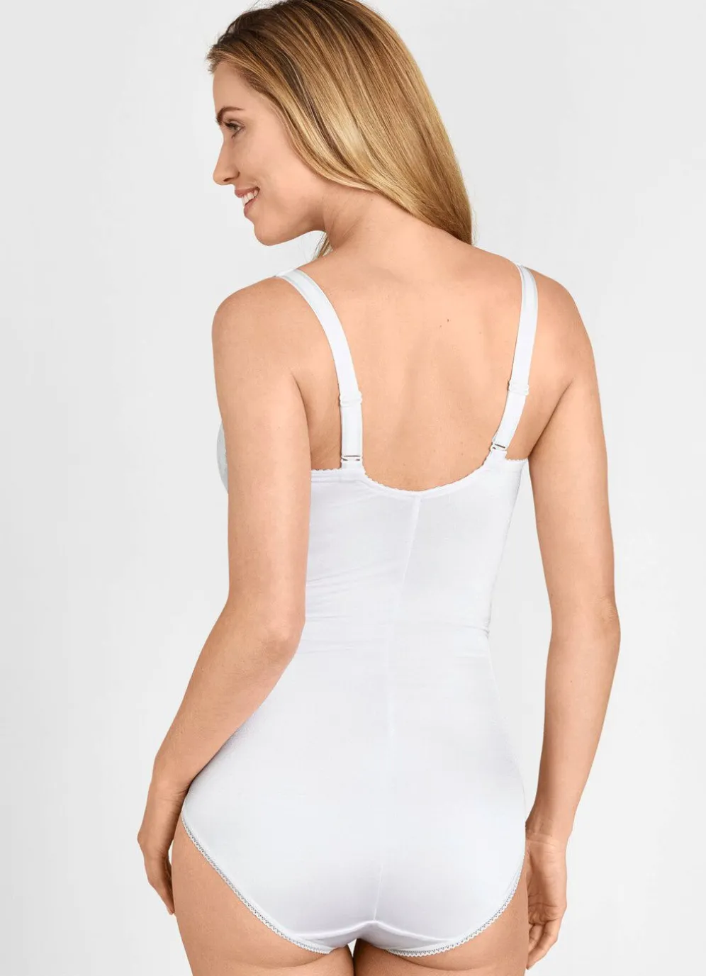 Sanft formendes „Miss Mary“-Hosenkorselett mit hübscher Elastikspitze im verstärkten Vorderteil sowie im Schulterbereich breiten, weich gepolsterten, verstellbaren Stretchträgern, die im Rücken über Kreuz getragen werden können. Der Hakenverschluss im baumwollgefütterten Schritt ist zum einfacheren Öffnen weiter nach vorne versetzt.