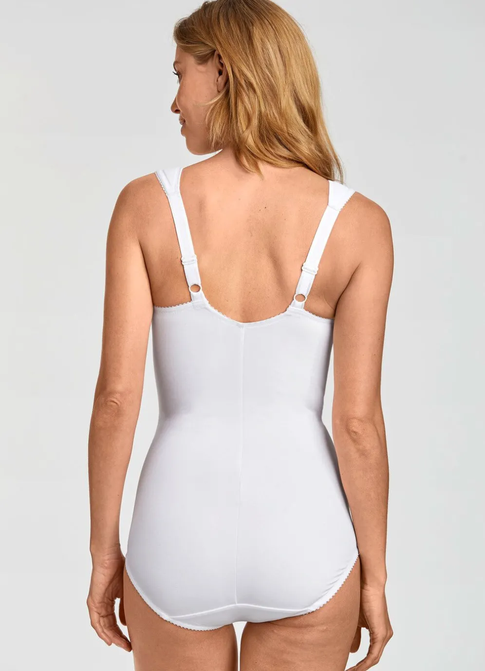 „Miss Mary“-Hosenkorselett mit unterlegter Elastikspitze und Elastiktüll in den Obercups, im Schulterbereich breiten, weich gepolsterten, verstellbaren Stretchträgern, Hakenverschluss und Baumwolleinlage im Schritt.