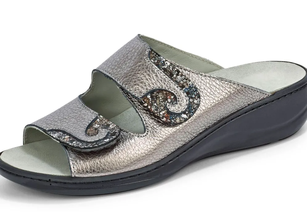 Pantoletten aus Rind-Nappa- oder Knautschlackleder, mit geprägten Einsätzen: Weite H, zwei Klettspangen, Lederfutter, herausnehmbares Lederfußbett, PU-TR-Profilsohle sowie 35 mm Keilabsatz