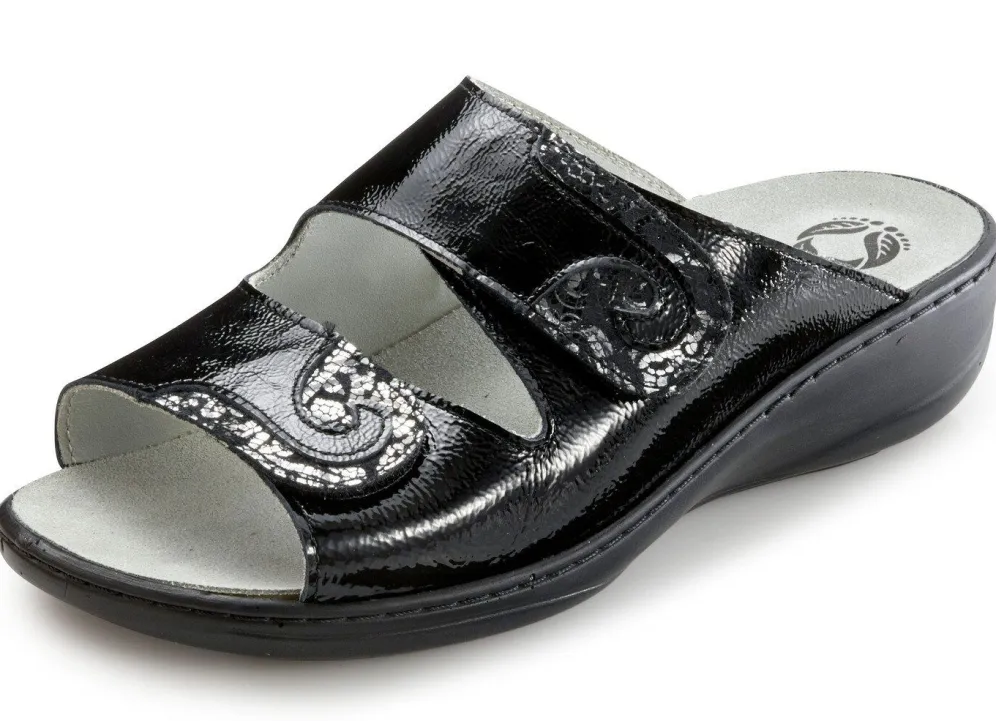 Pantoletten aus Rind-Nappa- oder Knautschlackleder, mit geprägten Einsätzen: Weite H, zwei Klettspangen, Lederfutter, herausnehmbares Lederfußbett, PU-TR-Profilsohle sowie 35 mm Keilabsatz