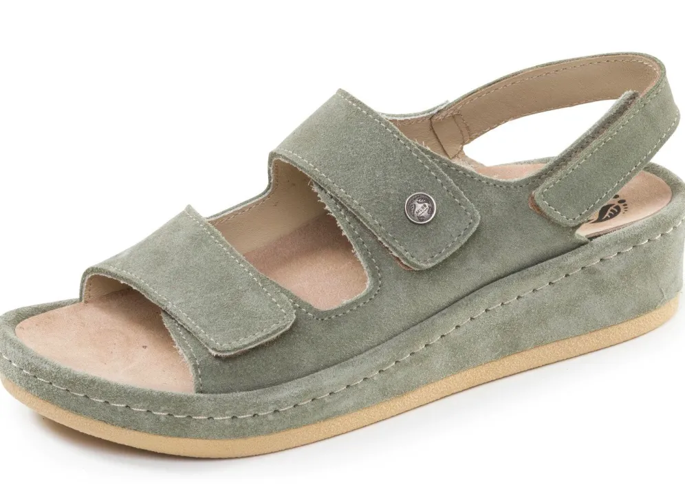 Sandalen aus weichem Veloursleder mit drei verstellbaren Klettspangen: Weite H, Lederfutter, herausnehmbares Lederfußbett, leichte PU-Laufsohle sowie lederbezogener 25 mm Keilabsatz