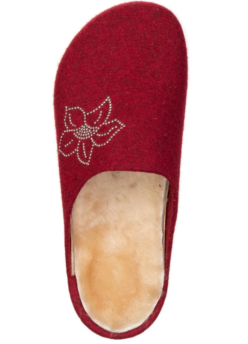 Hausschuhe aus Wollfilz mit Glitzer-Applikation: in Weite H, herausnehmbares, mit echtem Lammfell bezogenes Fußbett, leichte PU-TR-Laufsohle sowie 35 mm Keilabsatz