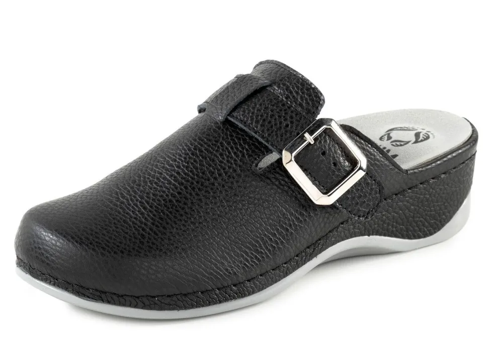 Clogs aus genarbtem Nappaleder, mit angenehmer Polsterung: Weite H, verstellbare Schließe, elastisches Textilfutter, herausnehmbares Lederfußbett, PU-TR-Laufsohle sowie 35 mm Keilabsatz