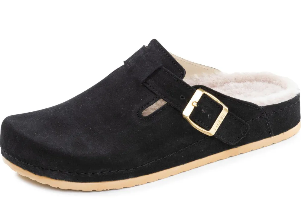 Hausschuhe aus Rind-Veloursleder, mit verstellbarer Spange: in Weite H, Lederfutter, Fußbett mit echtem Lammfell bezogen, superleichte PU-TR-Profilsohle sowie 15 mm Keilabsatz