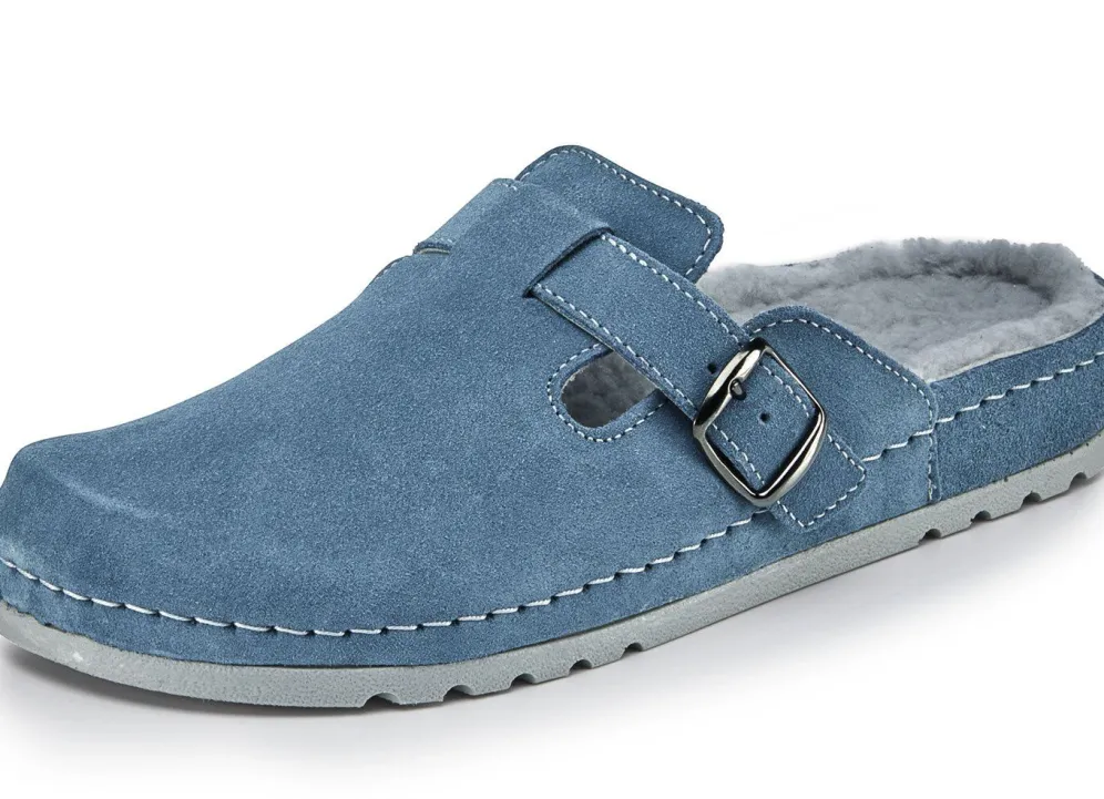 Hausschuhe aus Rind-Veloursleder, mit verstellbarer Spange: in Weite H, Lederfutter, Fußbett mit echtem Lammfell bezogen, superleichte PU-TR-Profilsohle sowie 15 mm Keilabsatz