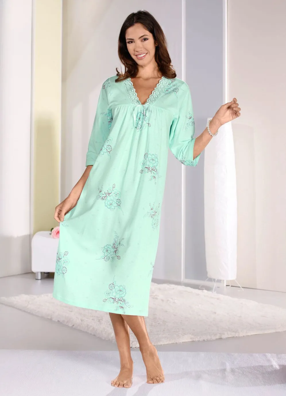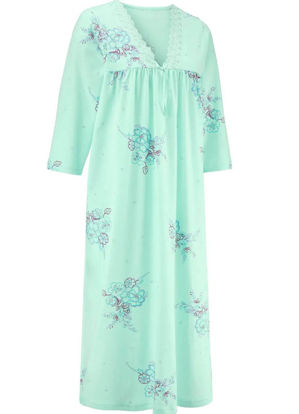 Hinreißendes, wadenlanges Nachthemd mit Stickereispitze am V-Ausschnitt, Satinzierschleife, Raffungen an der Vorderpasse sowie 3/4-langen Ärmeln.