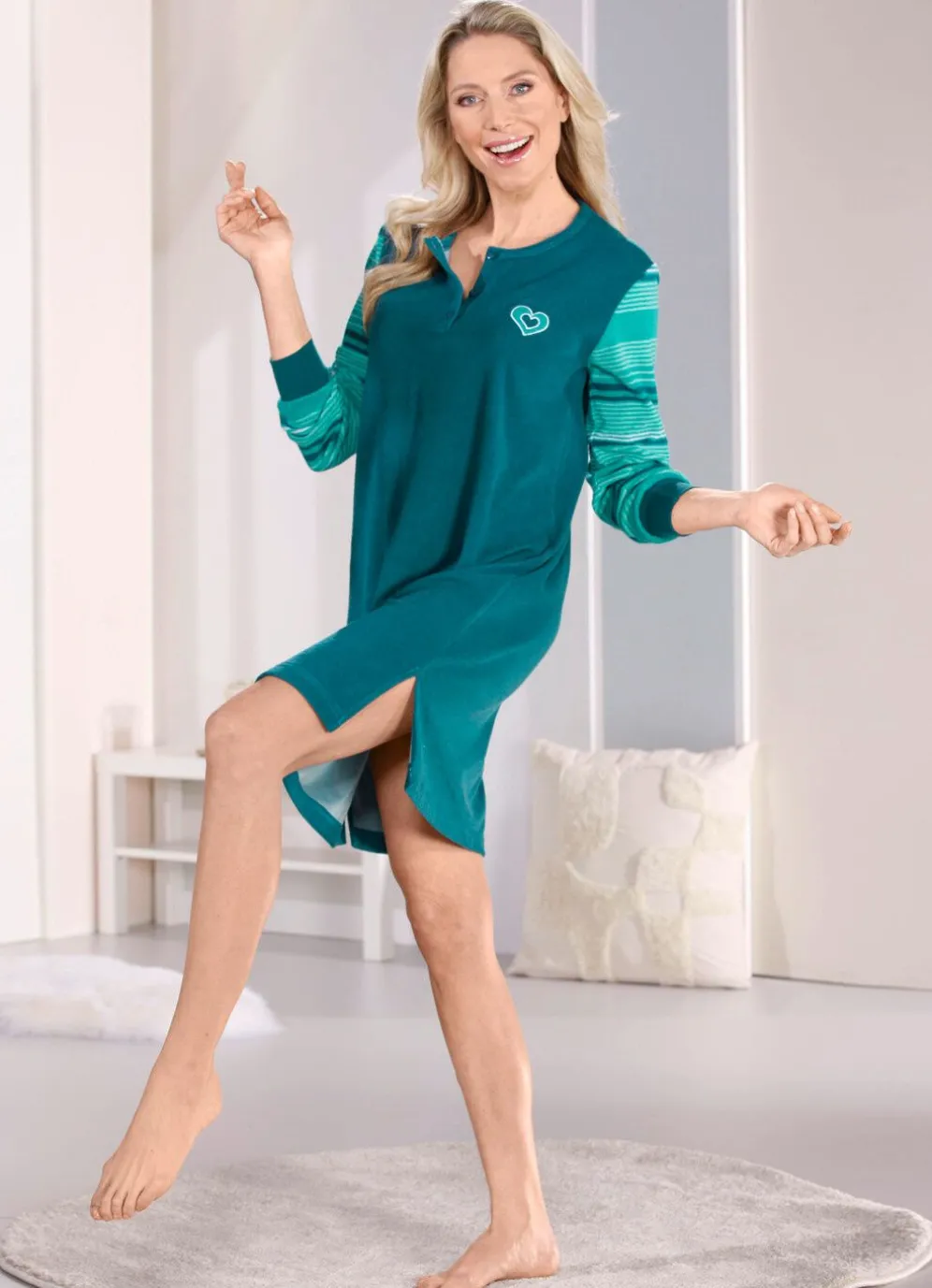 Knielanges Nachthemd in Petrol-Bunt: Knopfleiste, platzierte „Herzchen“-Stickerei, lange Raglanärmel