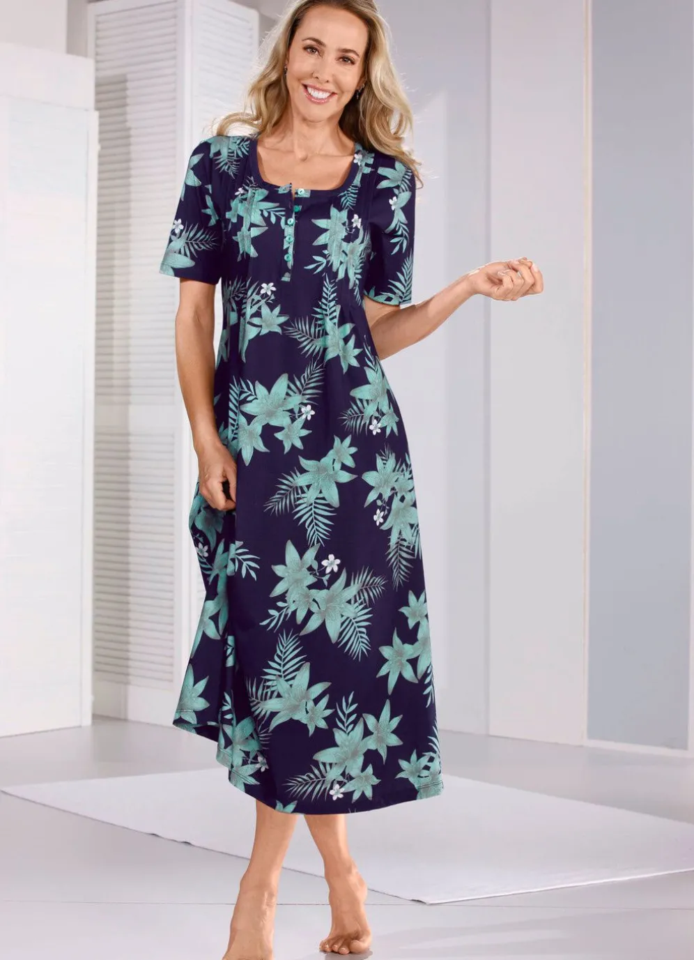 Knöchellanges Nachthemd in Marine-Mint, mit Knopfleiste, aufwendiger Biesenverarbeitung