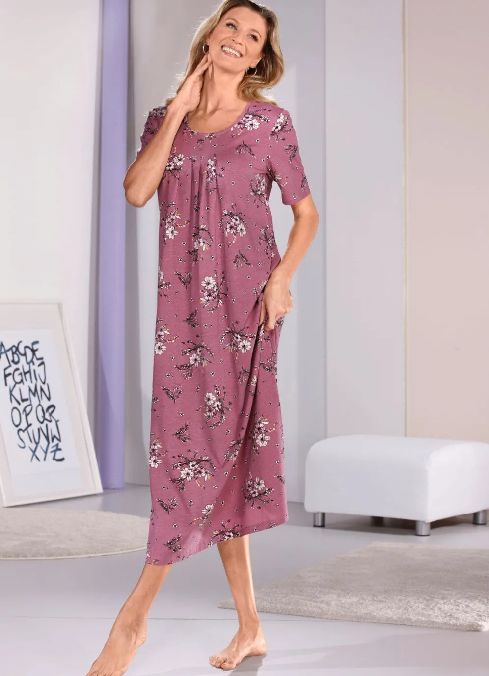 Schönes, knöchellanges Nachthemd, mit Absteppung und Faltenlegung vorne sowie kurzen Ärmeln.