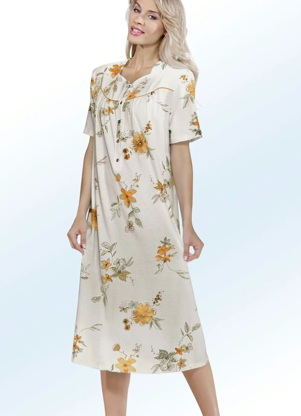 Feminines, wadenlanges Nachthemd mit langer Knopfleiste, Paspelzier an der Vorderpasse, Raffungen vorne sowie kurzen Ärmeln.