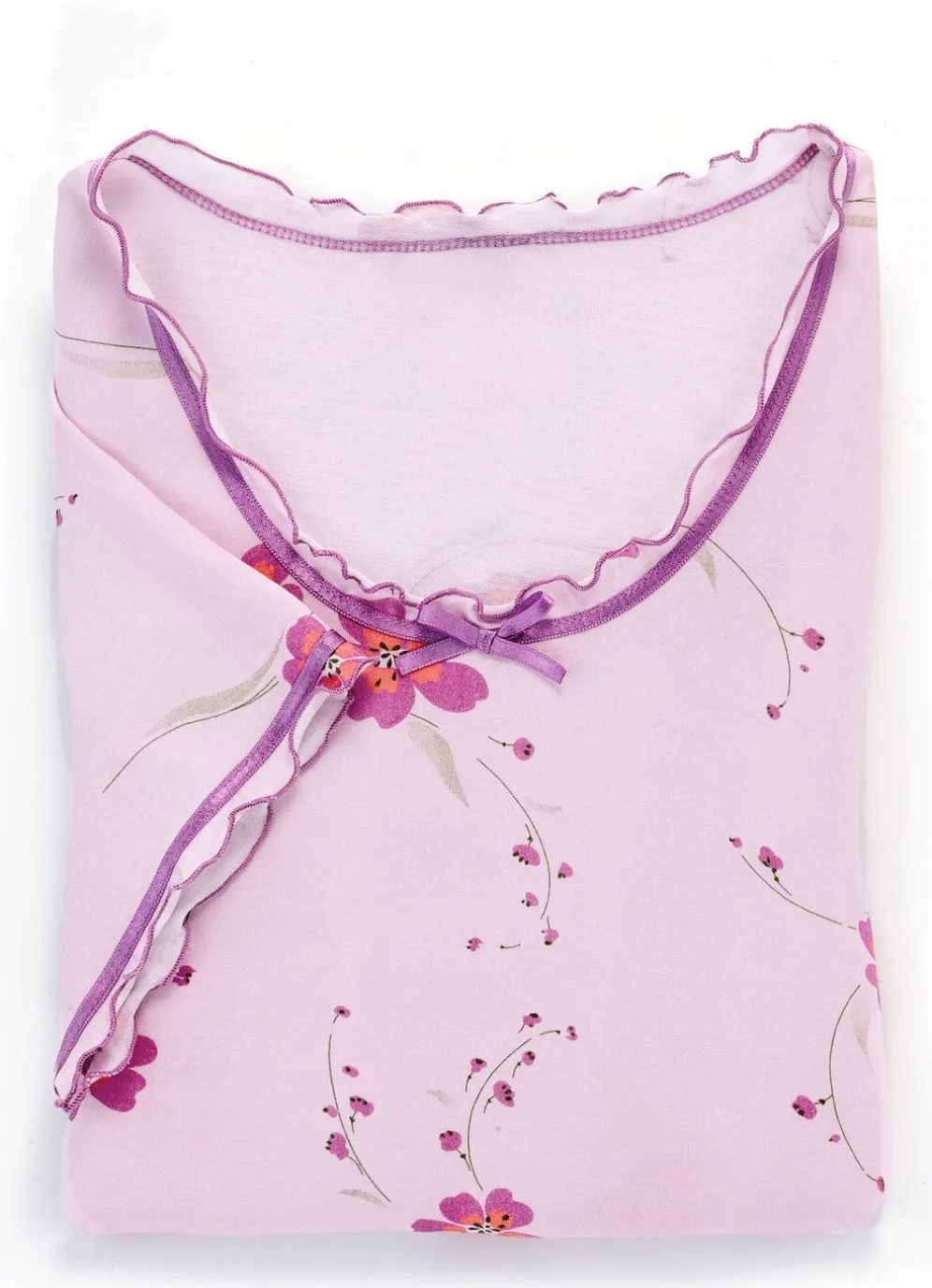 Hübsches, wadenlanges Nachthemd mit Satinbandbesatz am V-Ausschnitt und an den kurzen Ärmeln, Bindeschleife sowie gebogten Abschlüssen.