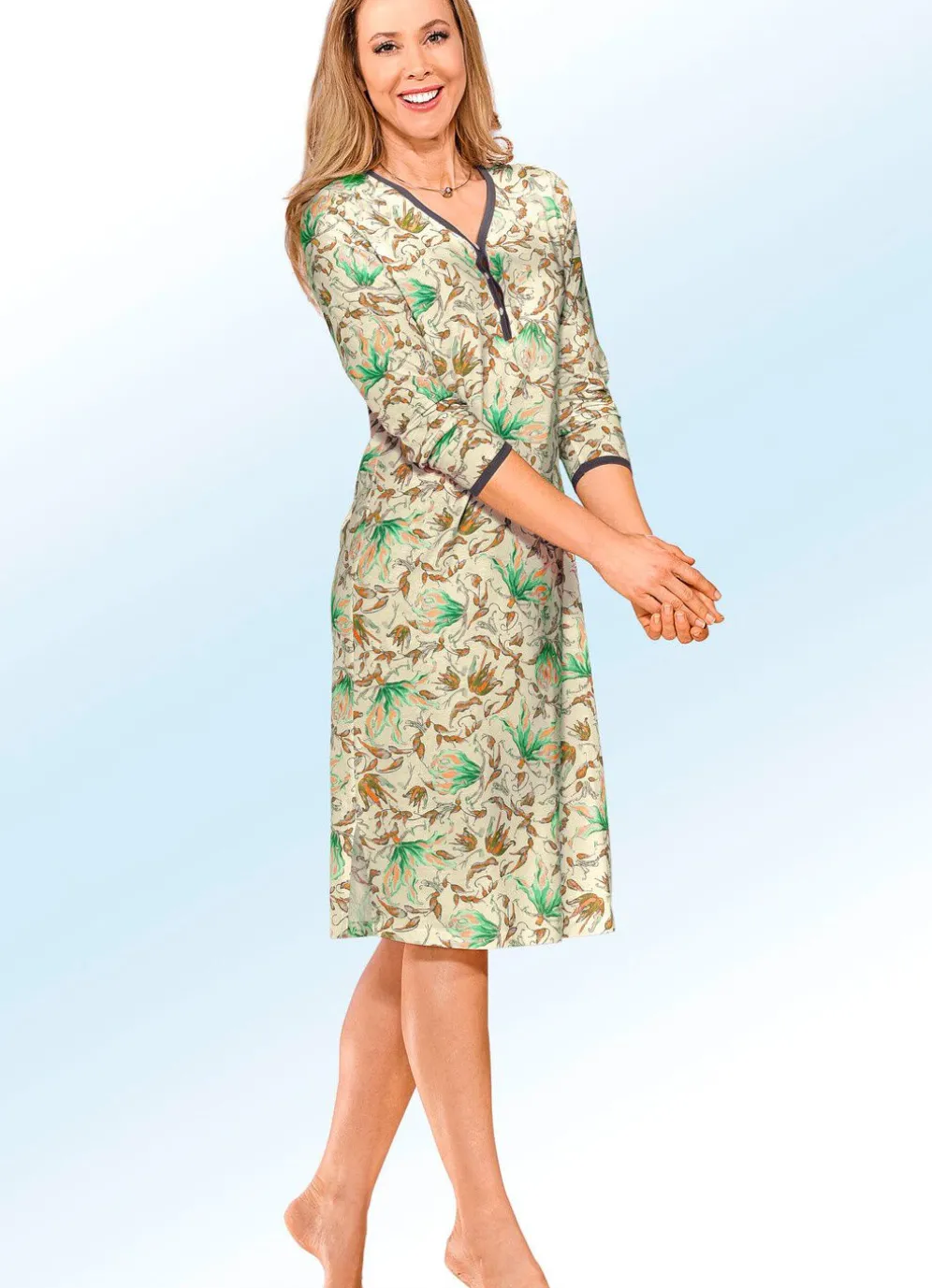 Tolles, wadenlanges Nachthemd mit Einfassung am Ausschnitt, entlang der Knopfleiste und am Abschluss der langen Ärmel sowie Seitenschlitze.