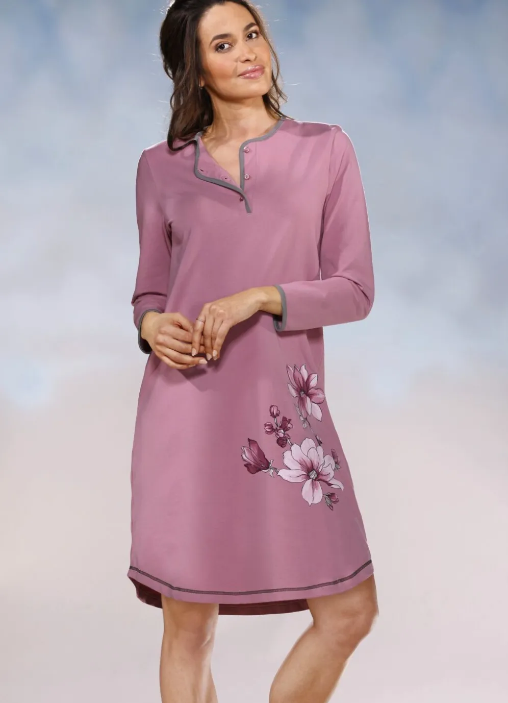 Hübsches, kürzer geschnittenes Nachthemd in Rosenquarz, mit Knopfleiste, platziertem Druck, langen Ärmeln sowie abgerundetem Saum.