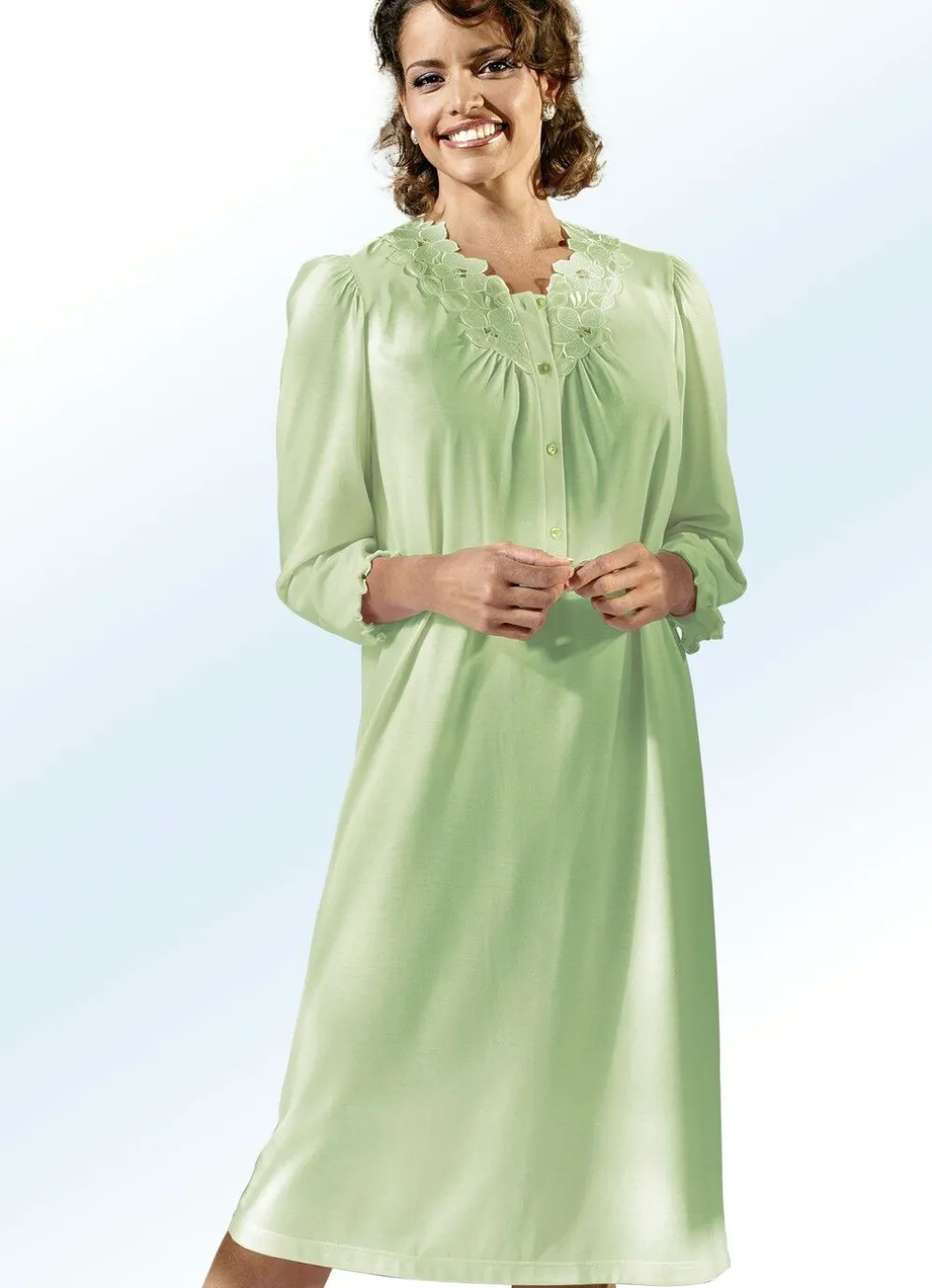 Bildschönes, wadenlanges Nachthemd mit feiner Spitze am vorderen Dekolleté, langer Knopfleiste sowie Raffung vorne und am Ansatz der langen Ärmel mit gebogten Abschlüssen.