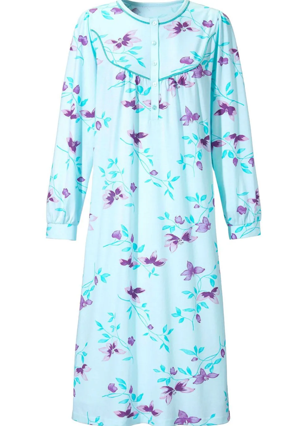 Wadenlanges Nachthemd in Aqua-Pflaume-Bunt, mit langer Knopfleiste, Kontrastpaspel an Ausschnitt