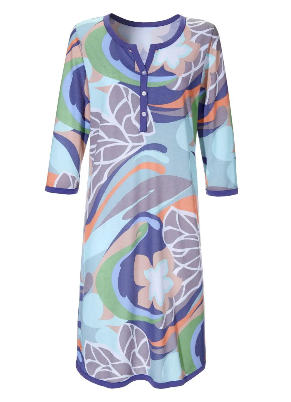 Wundervolles, knielanges Nachthemd mit Einfassung an Ausschnitt und Knopfleiste, den 3/4-langen Ärmeln sowie am abgerundeten Saum.