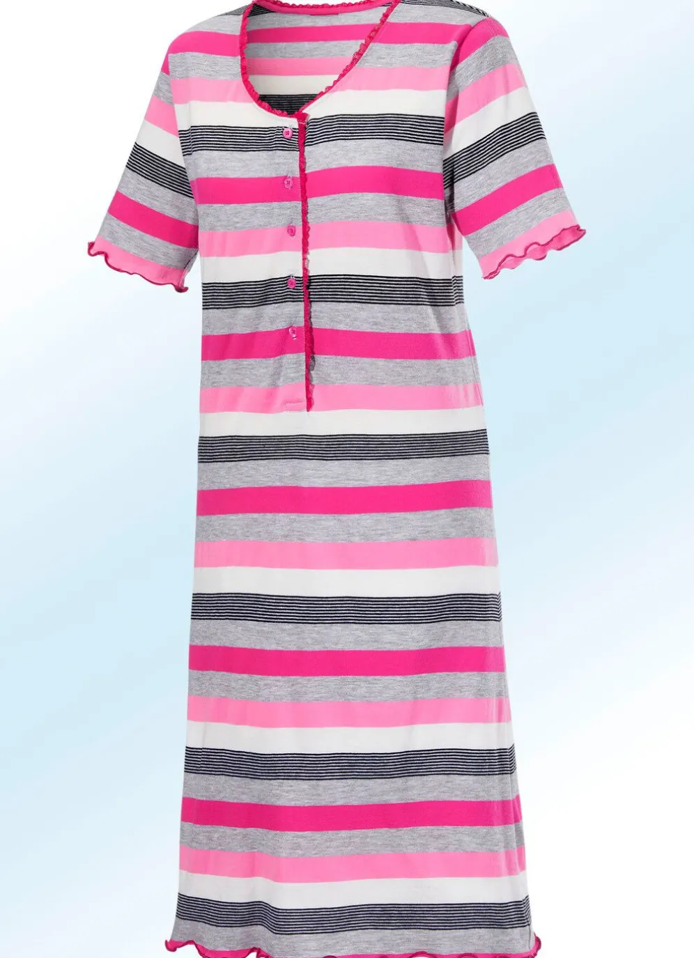 Hübsches, kürzer geschnittenes Nachthemd mit garngefärbtem Ringeldessin, Häkelborte am Ausschnitt und entlang der langen Knopfleiste, gebogten Abschlüssen an den kurzen Ärmeln sowie am Saum.