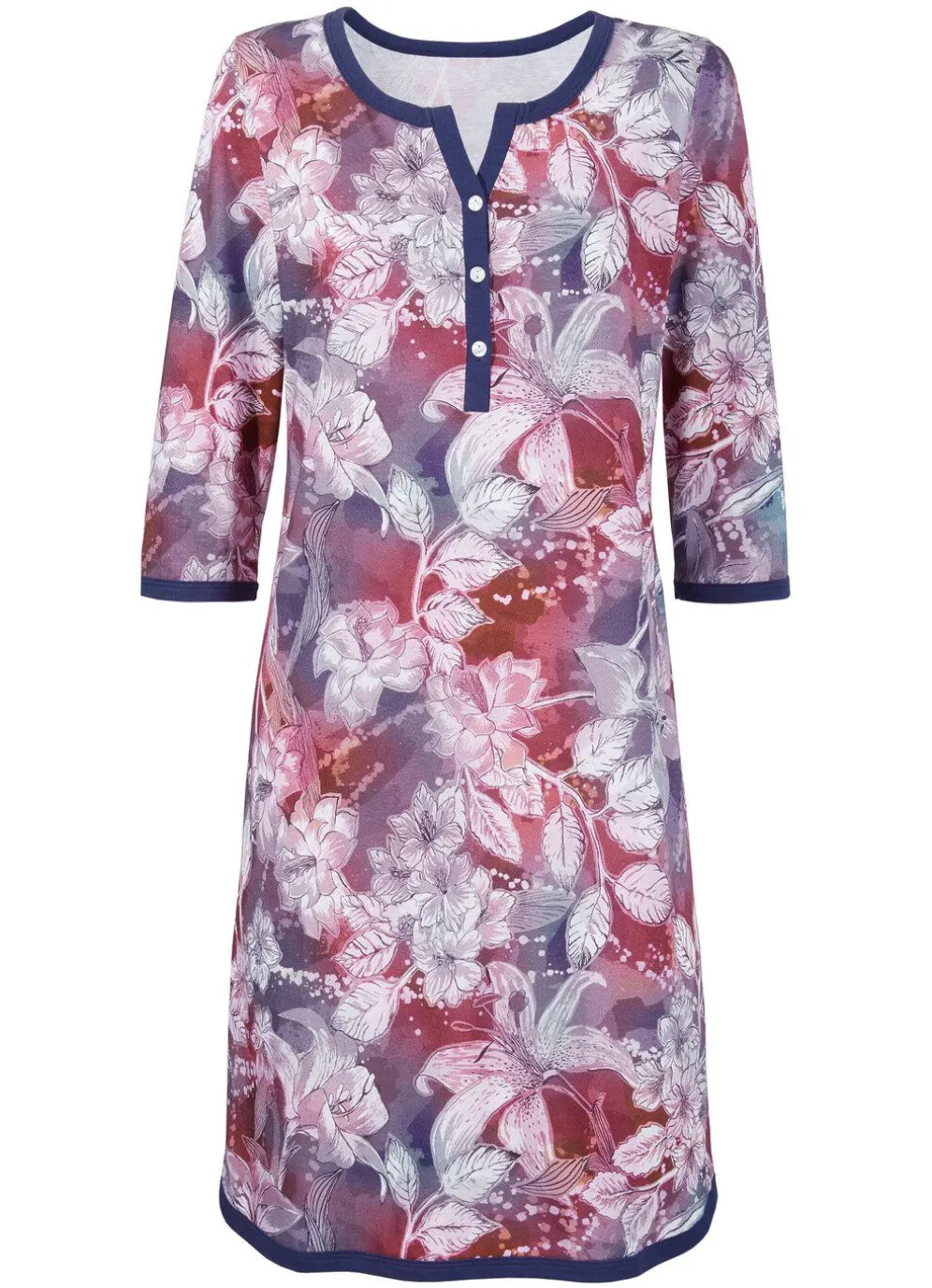 Traumhaftes, knielanges Nachthemd mit farbbrillantem Druckdessin, Einfassungen, Knopfleiste, 3/4 langen Ärmeln sowie abgerundetem Saum.