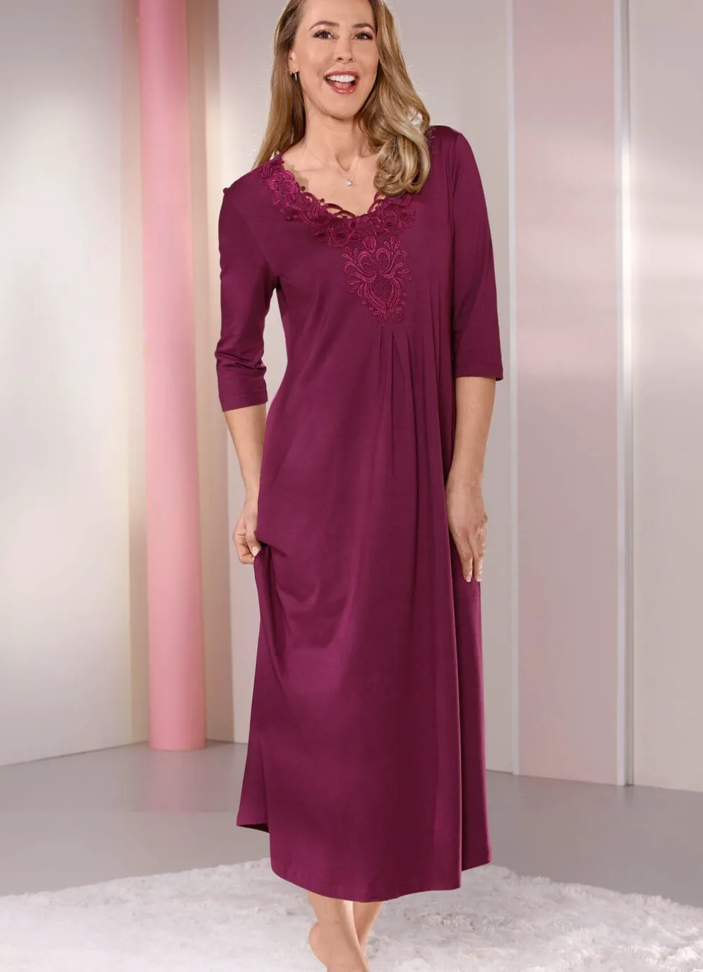 Zauberhaftes, knöchellanges Nachthemd mit Motivspitze und Faltenlegung im Vorderteil sowie 3/4-langen Ärmeln.