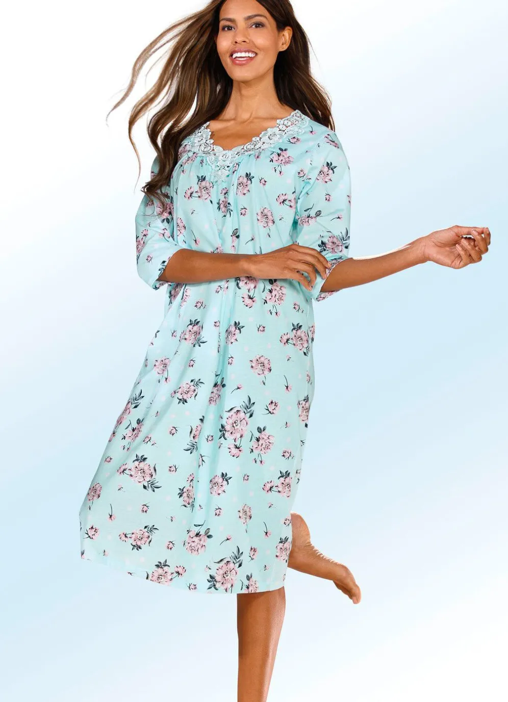 Hübsches, wadenlanges Nachthemd mit floraler Stickereispitze, Raffungen im Vorderteil sowie 3/4-lange Ärmel.