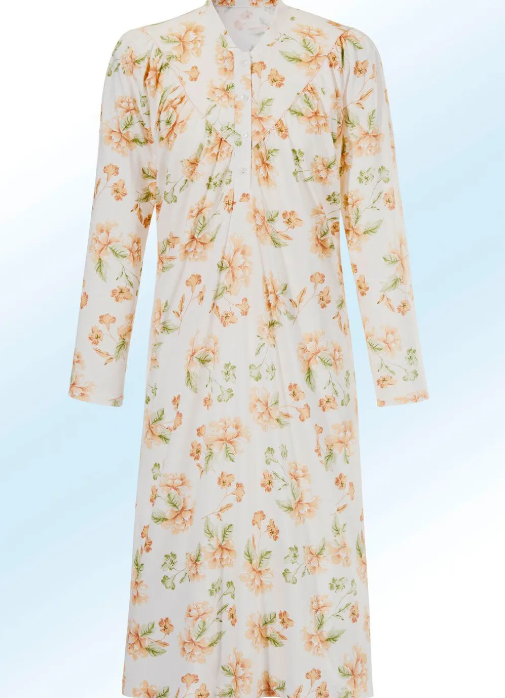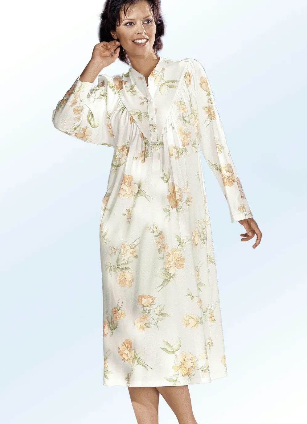 Dieses wadenlange Nachthemd mit zauberhaftem Alloverdessin ist mit Stehkragen, Knopfleiste sowie Raffung und Paspelierung entlang der V-förmigen Vorderteilpasse ausgestattet.