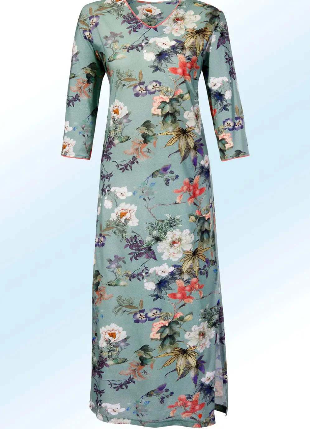 Wundervolles, wadenlanges Nachthemd: farbbrillantem Druckdessin allover, V-Ausschnittblende und Abschlüsse der 3/4-langen Ärmel mit Paspel sowie Seitenschlitz.