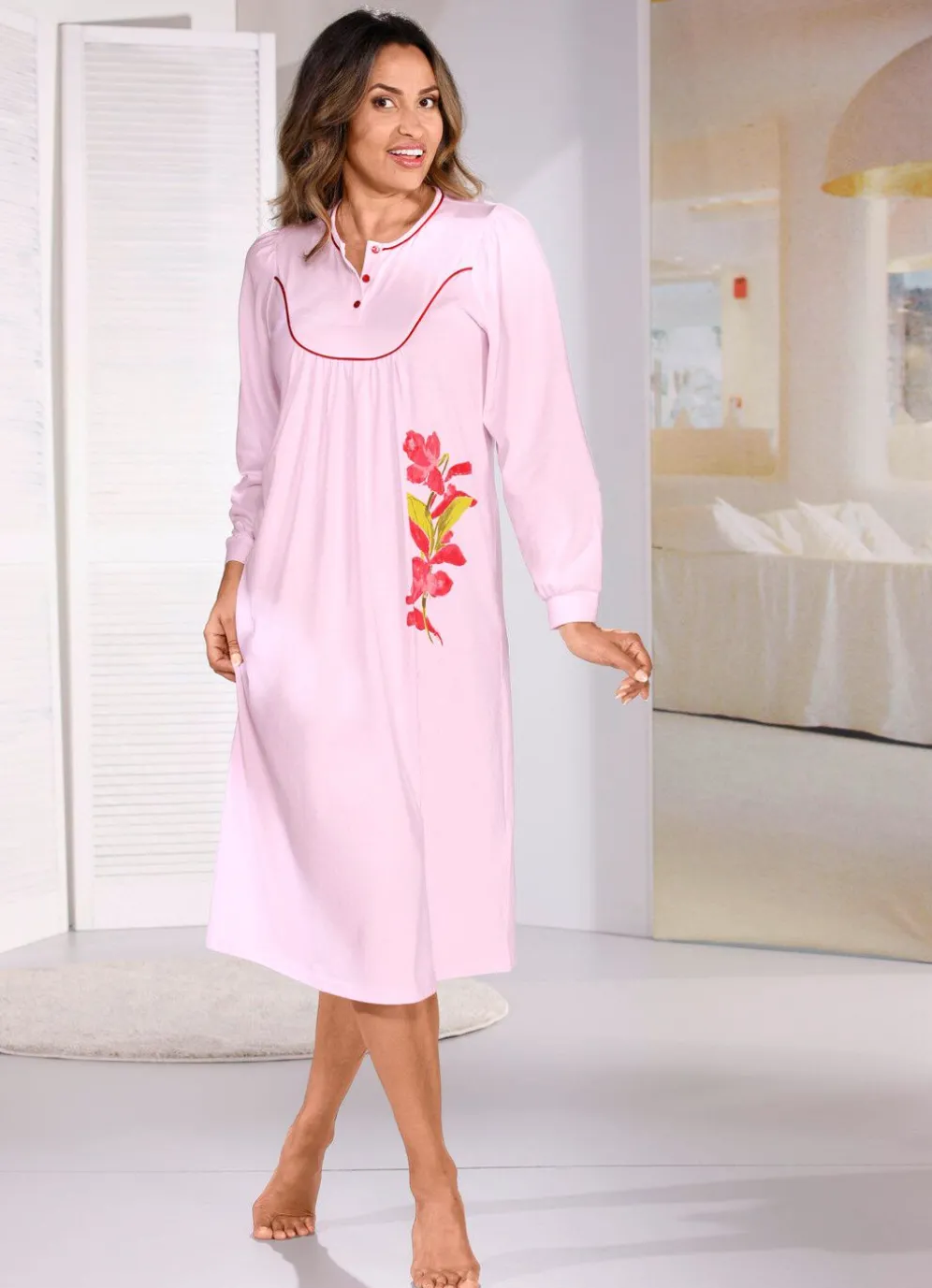 Wadenlanges Nachthemd mit Knopfleiste, Satinpaspel an Halsausschnitt und Vorderpasse,
