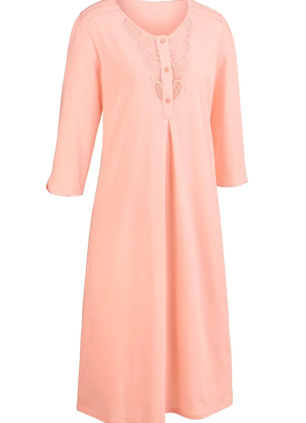 Wadenlanges Nachthemd mit Biesen, Raffungen, Satineinfassungen, transparenter Tüllstickereispitze entlang der Knopfleiste, Kellerfalte vorne sowie 3/4-langen Ärmeln mit abgerundetem Schlitz.