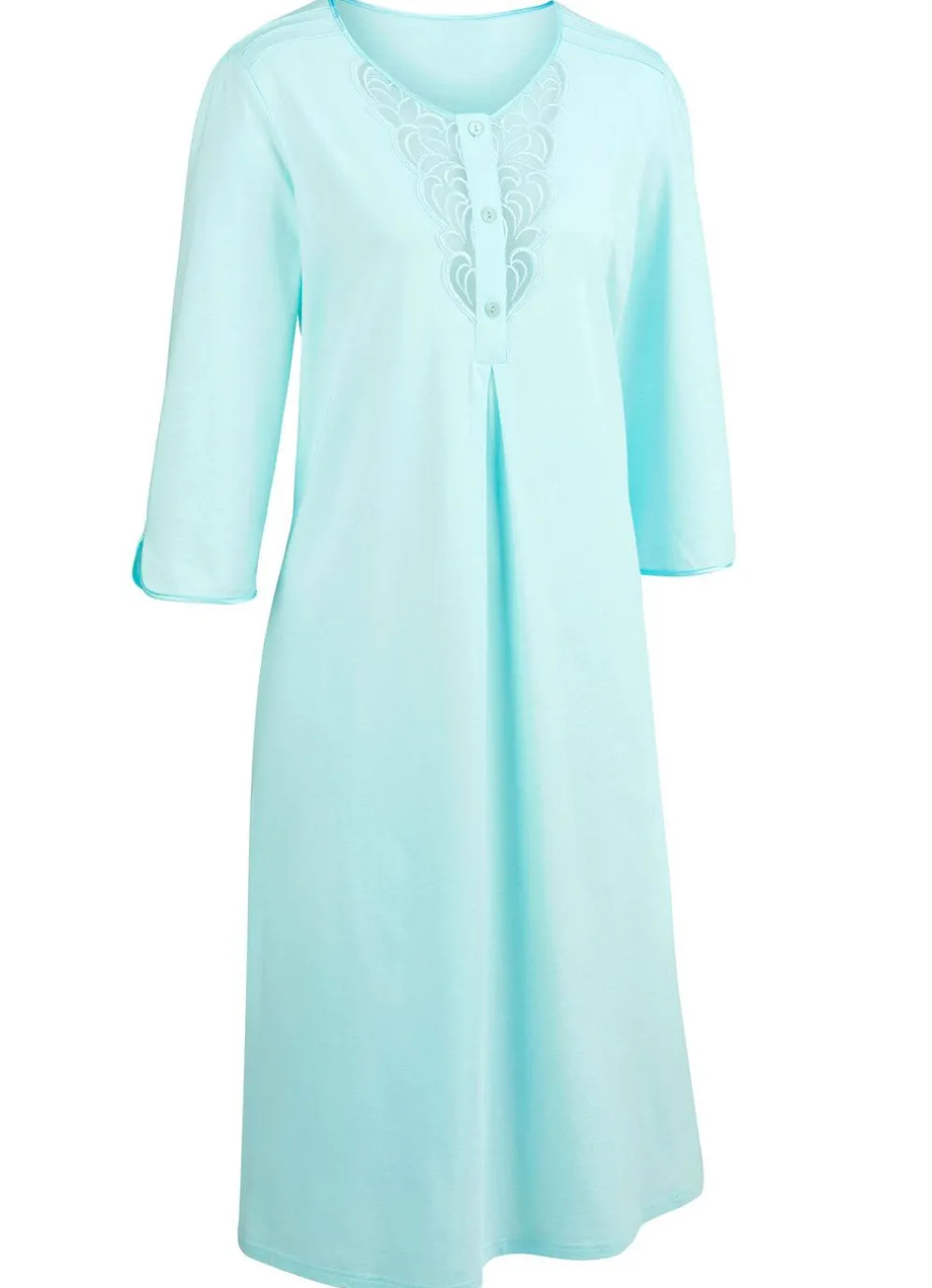 Wadenlanges Nachthemd mit Biesen, Raffungen, Satineinfassungen, transparenter Tüllstickereispitze entlang der Knopfleiste, Kellerfalte vorne sowie 3/4-langen Ärmeln mit abgerundetem Schlitz.